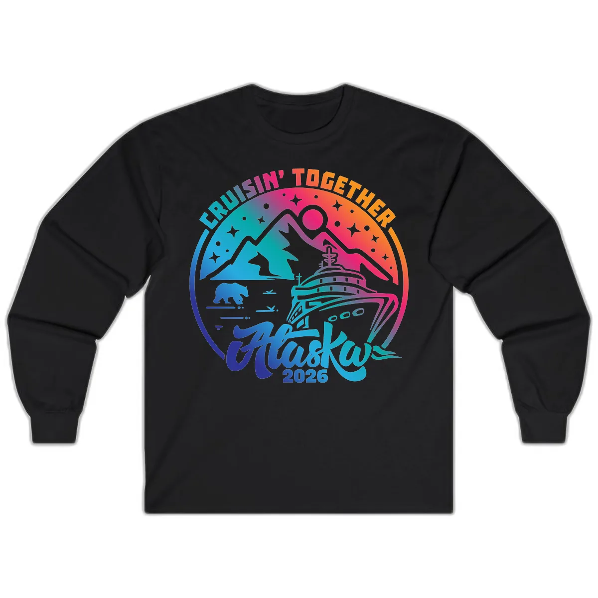 Prepare for your 2026 Alaska adventure with the Cruisin' Together Alaska 2026 Long Sleeve shirt! This design is your ticket to group unity and adventure-ready style. Featuring a vibrant, gradient-filled circular badge, it’s packed with iconic Alaskan elements: a majestic cruise ship navigating icy waters, towering snow-capped mountains, a formidable bear, and a leaping fish, all under a starry sky. The bold 'CRUISIN' TOGETHER Alaska 2026' text makes it clear your crew is ready to explore!