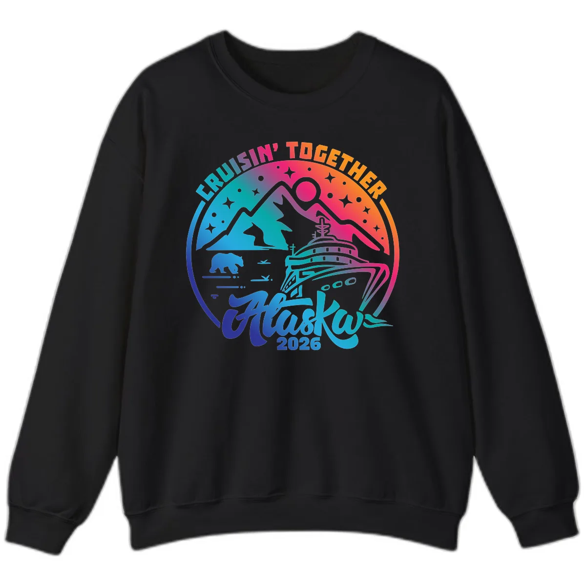Brrr-ing on the adventure! Our Cruisin' Together Alaska 2026 Sweatshirt is your group's ultimate cozy companion for exploring the Last Frontier. This super-soft sweatshirt features a stunning, vibrant circular badge packed with Alaskan icons: a majestic cruise ship, snow-capped mountains, a wild bear, a leaping fish, and a starry sky, all brought to life with a dazzling rainbow gradient. The bold 'CRUISIN' TOGETHER Alaska 2026' text ensures your squad stays united and warm!