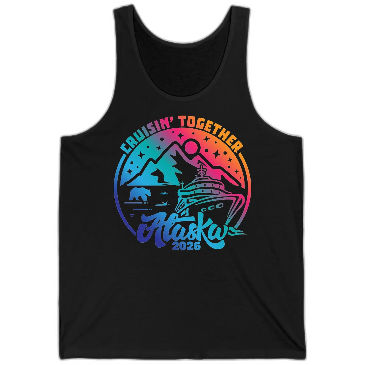 The vibrant 'Cruisin' Together Alaska 2026' circular badge looks fantastic on this tank top, with the colorful gradient and detailed graphics making a bold statement. It's a fun way to showcase your cruise theme.