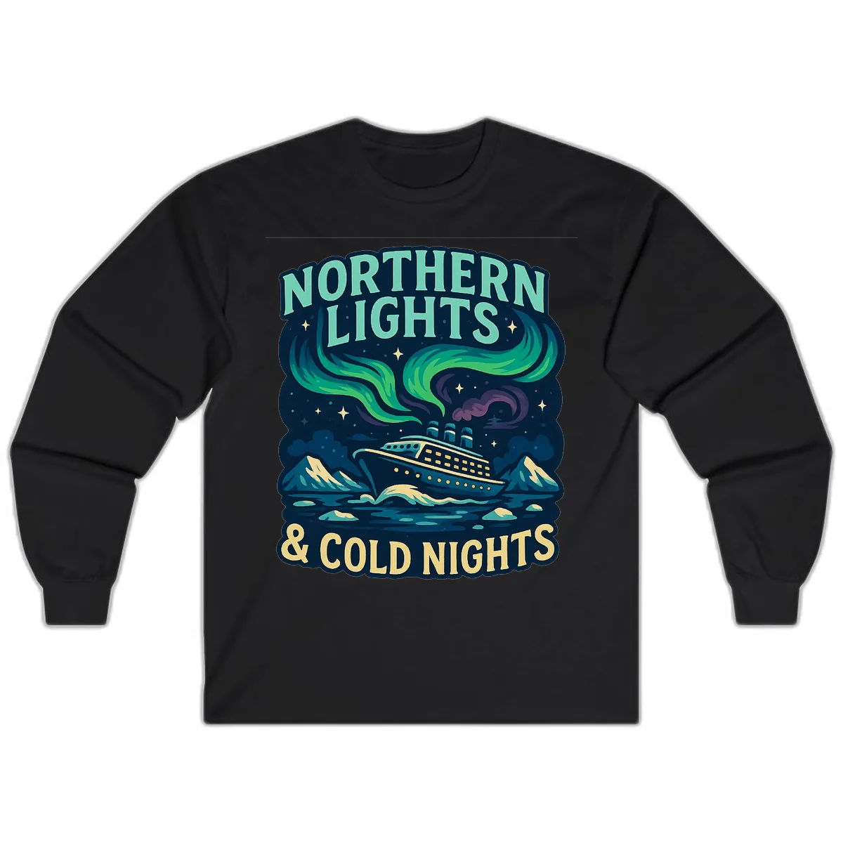 The main illustration and text of the 'Northern Lights & Cold Nights' design are featured prominently on the front of the long sleeve shirt, showcasing the full Arctic scene.