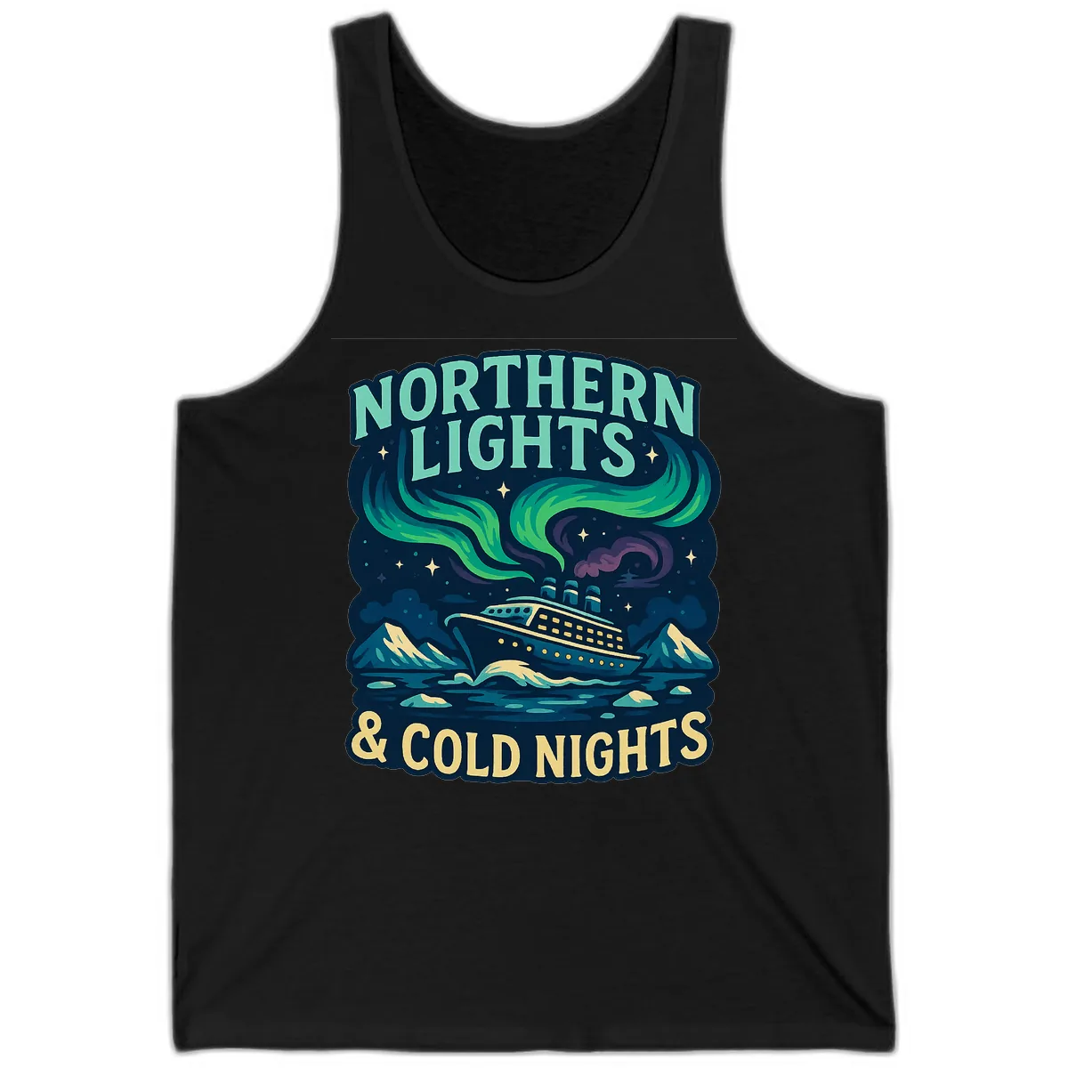 Soak up the sun and the stunning scenery with the "Northern Lights & Cold Nights" Tank Top. While designed for the magic of the Arctic night, this tank is perfect for warmer days onboard or as a breathable layer. It showcases a breathtaking Arctic scene: a luxury cruise ship sailing under a mesmerizing aurora borealis, framed by majestic mountains and icebergs. Embrace the spirit of adventure!