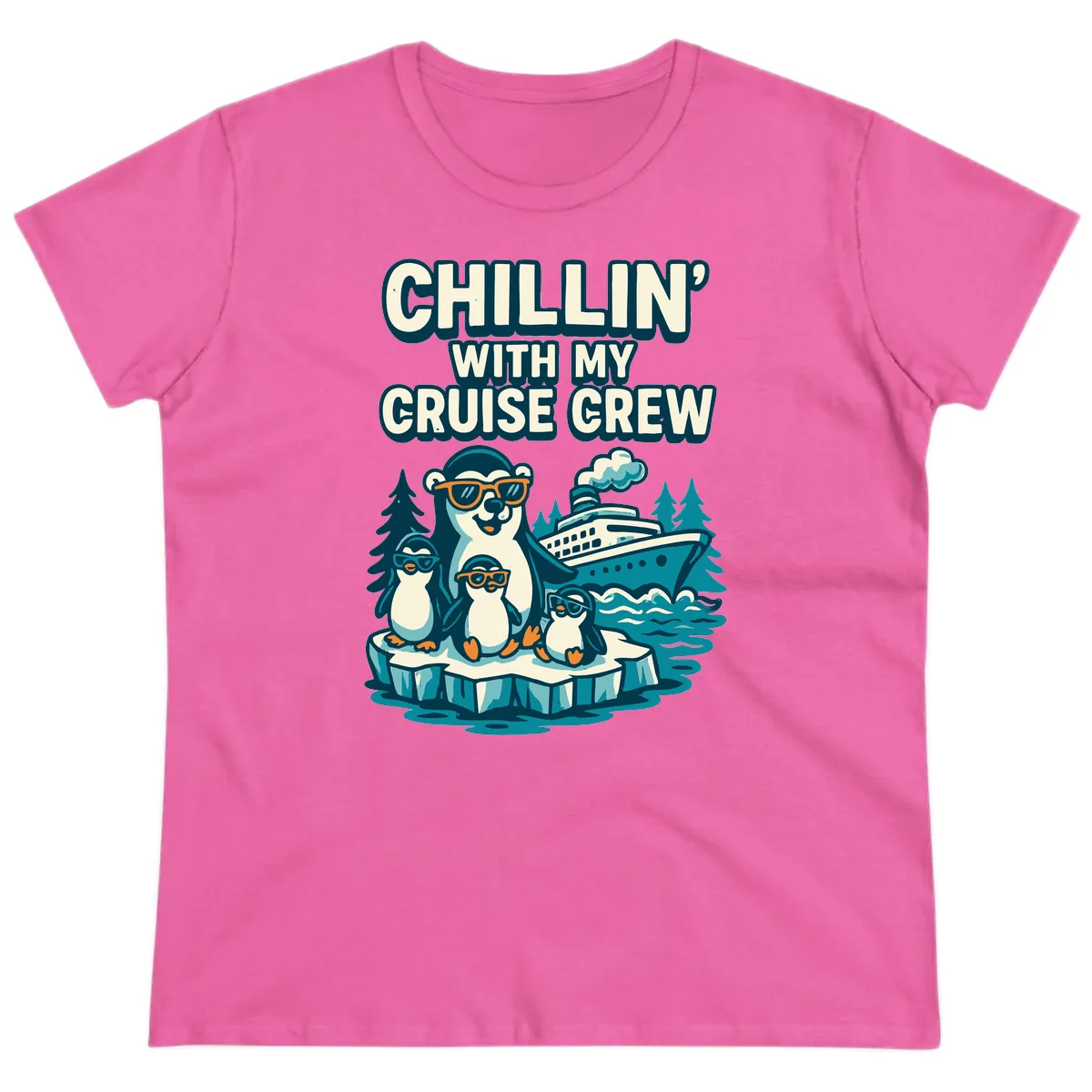 The playful penguin family illustration and 'CHILLIN' WITH MY CRUISE CREW' text are printed to complement the ladies' cut. It’s a fun and feminine way to show off your group's cruise spirit.