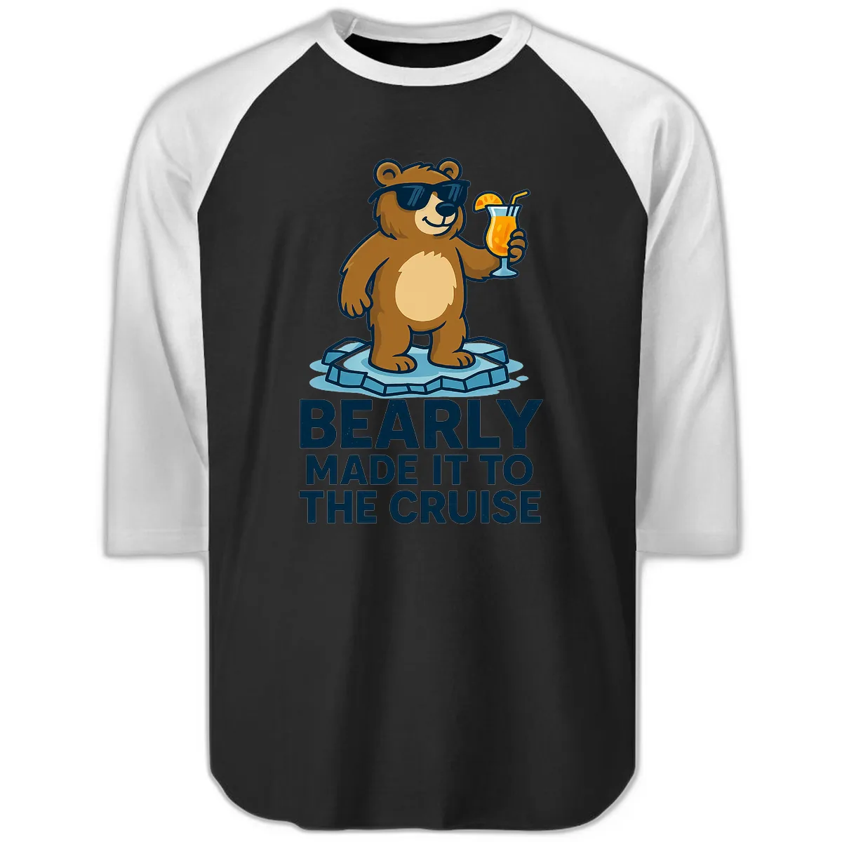 This raglan tee features contrasting 3/4 length sleeves for a classic, sporty look. The 'BEARLY MADE IT TO THE CRUISE' design, with its fun bear graphic, adds a playful touch perfect for your Alaska cruise.