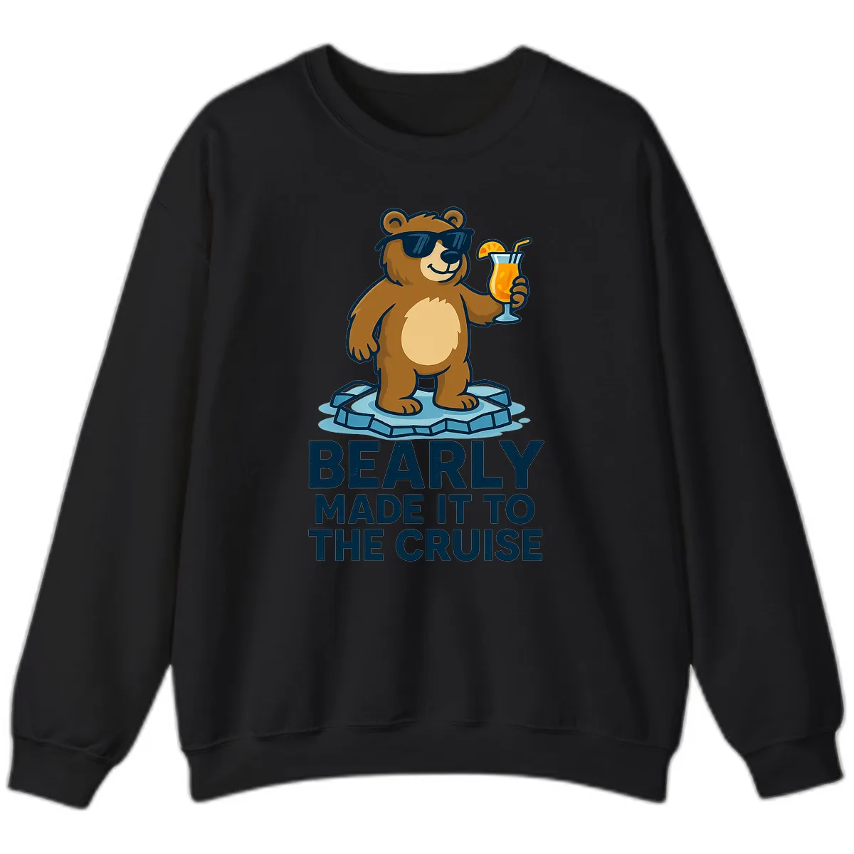 The 'BEARLY MADE IT TO THE CRUISE' design, featuring the cheerful cartoon bear in sunglasses with a tropical drink, is prominently displayed. It adds a fun, humorous touch to this cozy sweatshirt, celebrating your arrival.