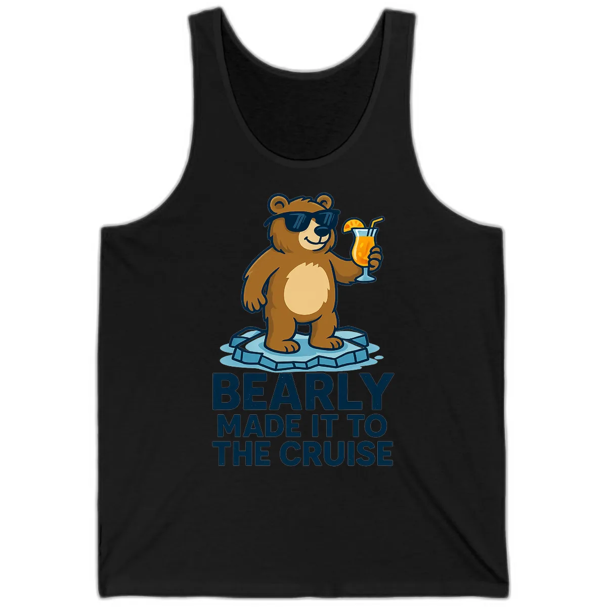 The cheerful cartoon bear in sunglasses, holding a tropical drink, along with the 'BEARLY MADE IT TO THE CRUISE' text, looks vibrant and fun on this tank top. It’s designed to capture the essence of vacation mode.