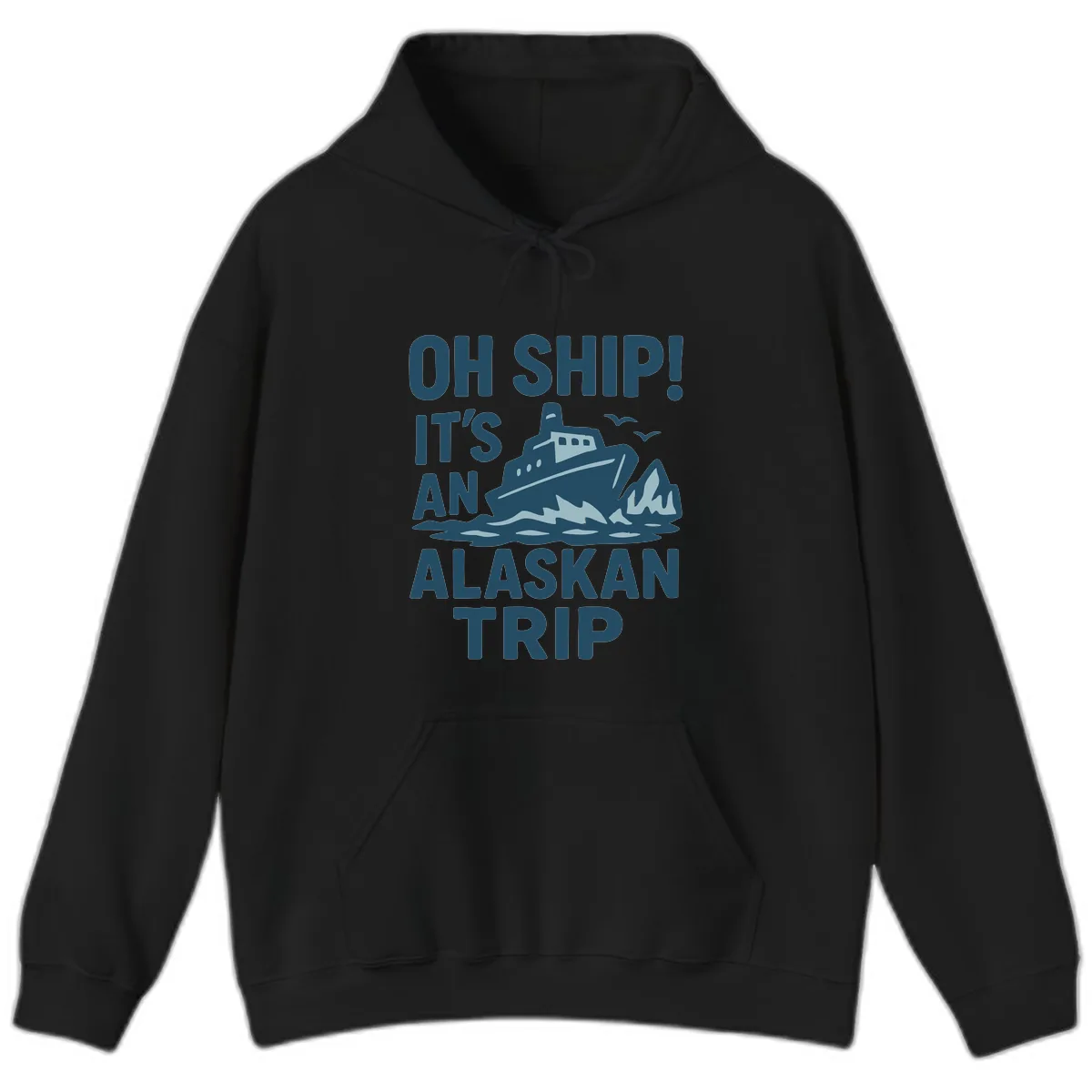 The 'OH SHIP! IT'S AN ALASKAN TRIP' design is printed on the body of the hoodie. The functional hood and drawstrings are standard features for added warmth and style.