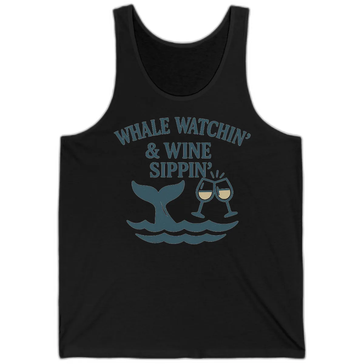 How does the 'Whale Watchin' & Wine Sippin'?' design look on a tank top?