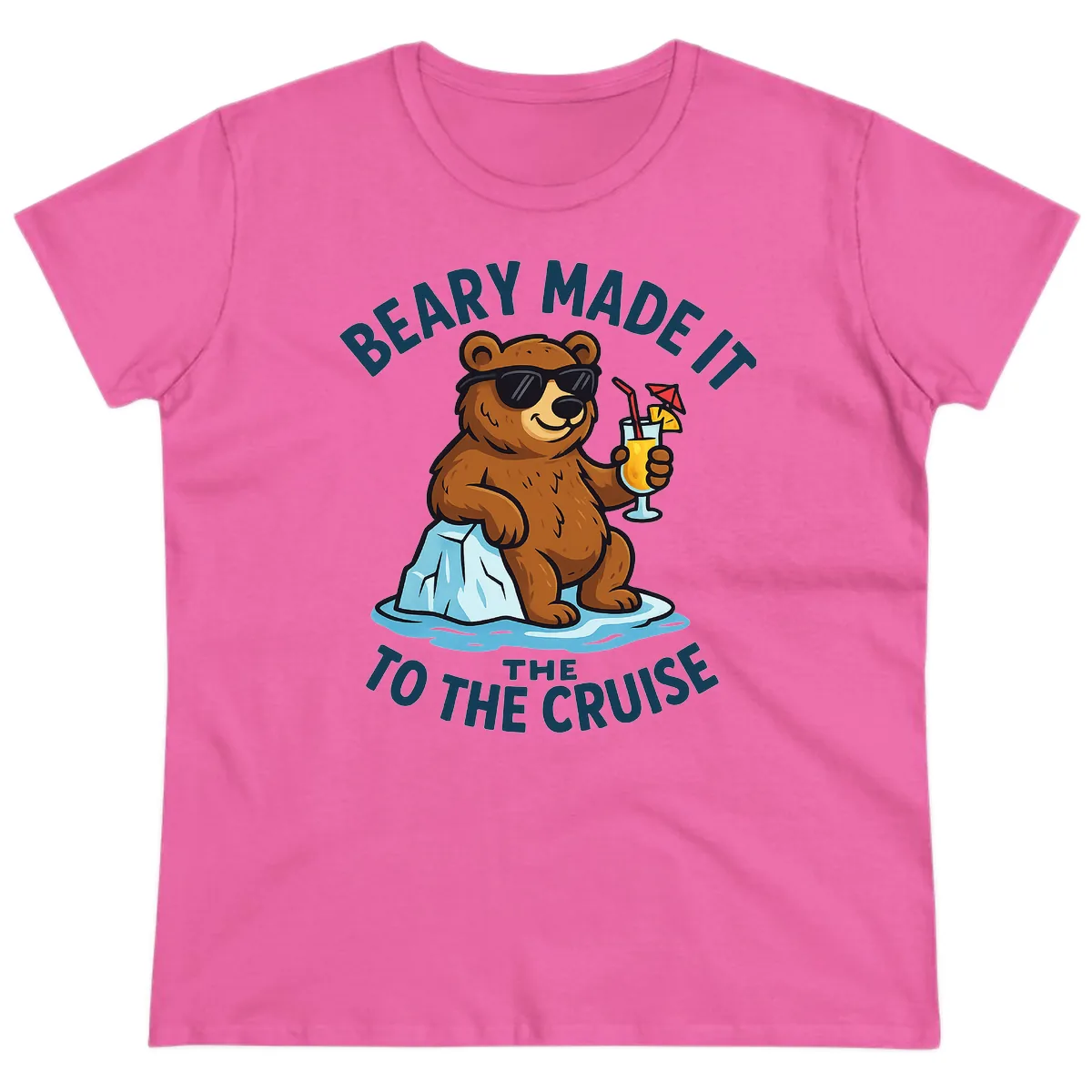 The playful bear illustration and the 'BEARY MADE IT TO THE CRUISE' text are printed to complement the ladies' fit. The design remains fun and eye-catching, tailored for a women's style.