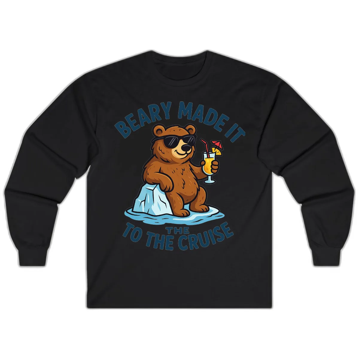The 'BEARY MADE IT TO THE CRUISE' design, featuring the cool bear, looks great on the long sleeve. It's positioned prominently on the front, ensuring your vacation humor is visible.