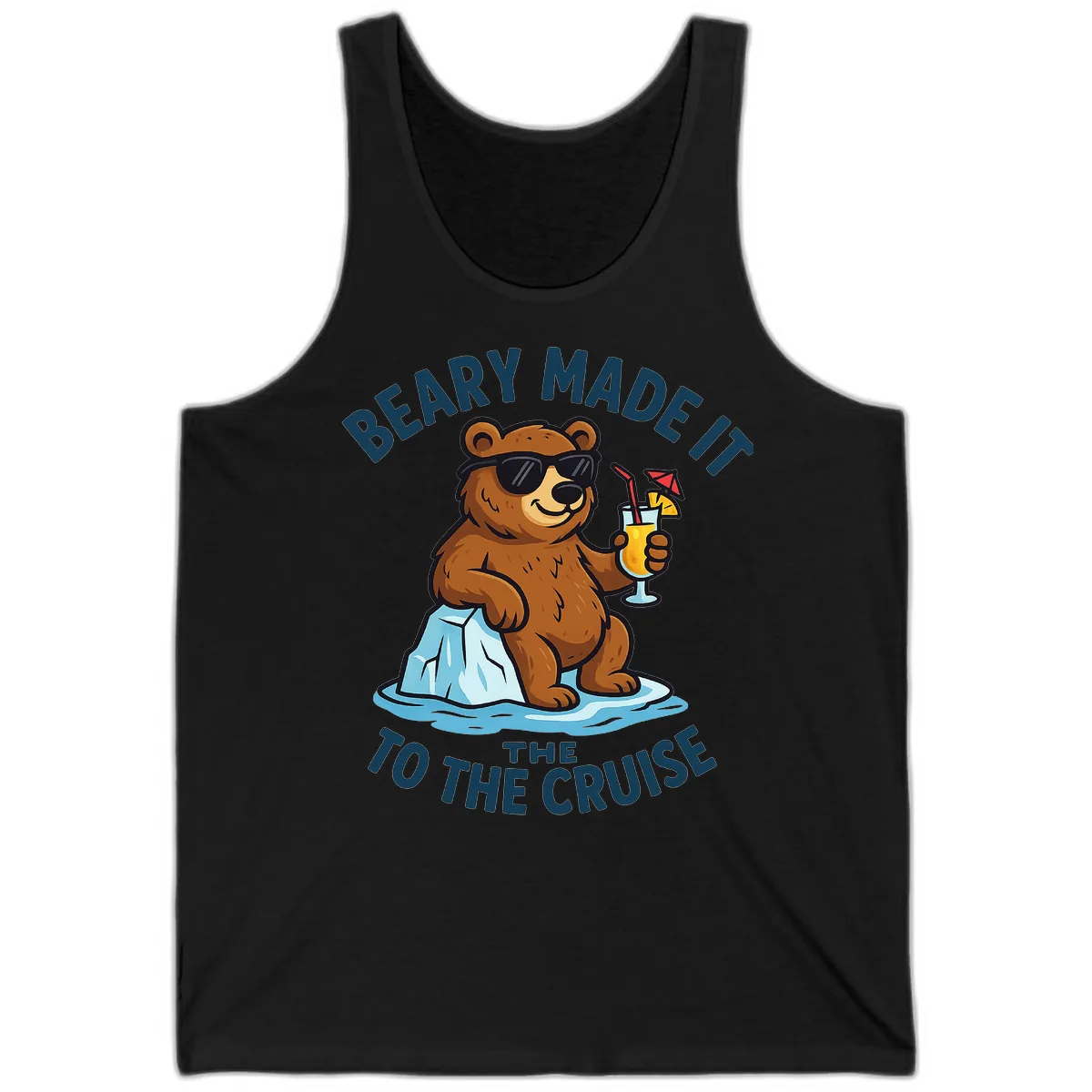 The 'BEARY MADE IT TO THE CRUISE' design featuring the cool bear looks vibrant and fun on this tank top. It's a great way to showcase your vacation humor in a casual, breezy style.