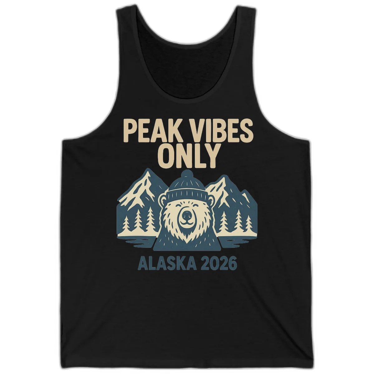 The 'Peak Vibes Only Alaska 2026' design, with its charming bear and mountain graphic, translates well to the tank top, offering a fun and casual way to showcase your cruise spirit.