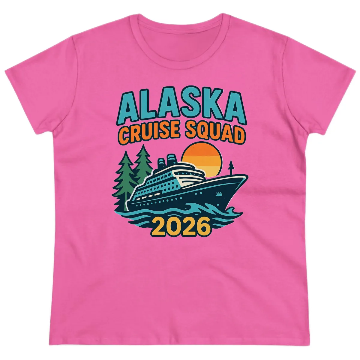 Sail into adventure with the "Alaska Cruise Squad 2026" ladies tee! This delightful shirt features a captivating illustration of a cruise ship cruising through Alaska’s breathtaking scenery, complete with majestic evergreen trees and a warm, colorful sunset. Designed to flatter and celebrate your group's journey, this tee is the perfect way to show off your squad pride and make unforgettable memories during your 2026 Alaska cruise. It’s fun, feminine, and totally cruise-ready!