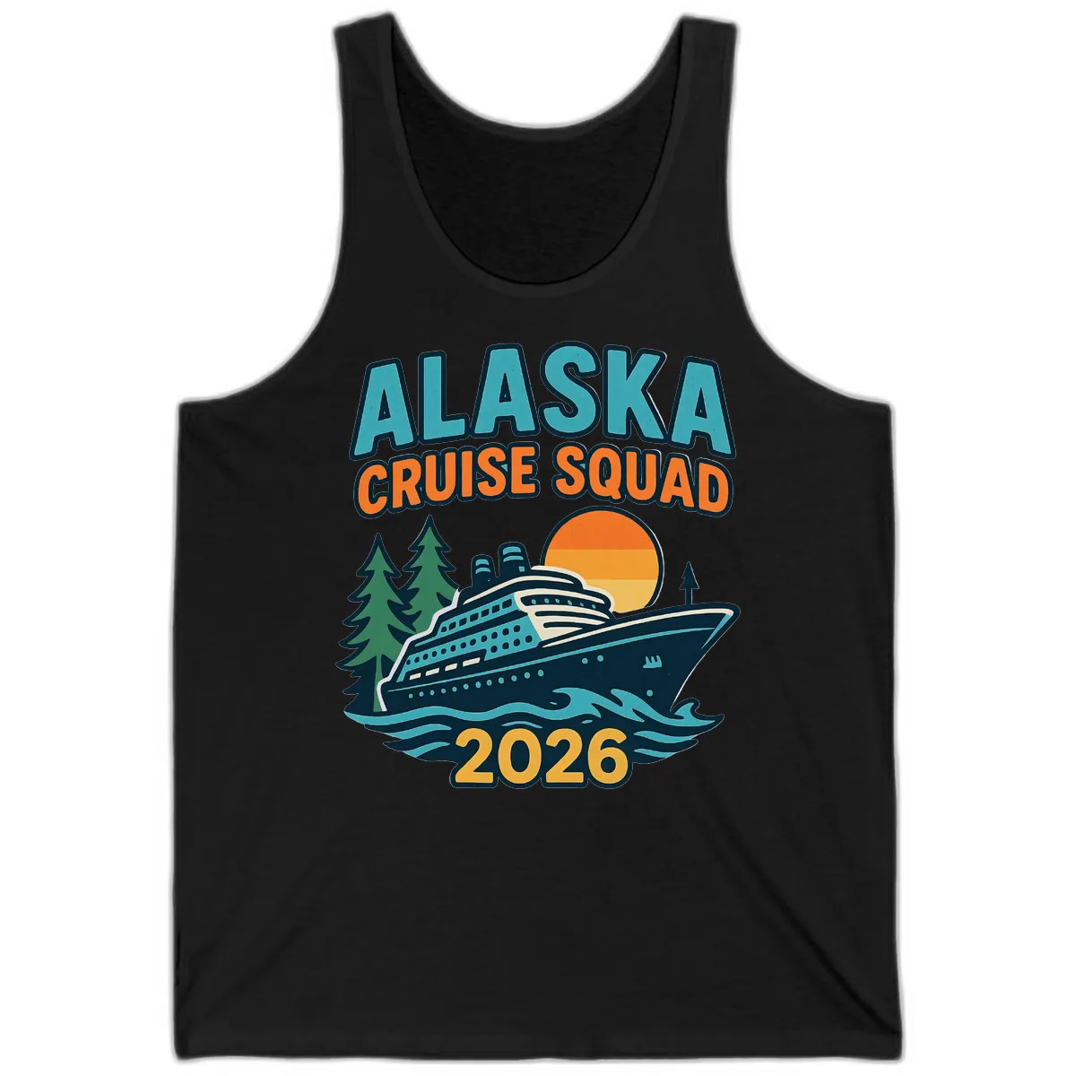 The vibrant cruise-themed illustration and bold 'ALASKA CRUISE SQUAD 2026' text are printed clearly on this tank top, allowing your group to show off their spirit in style.