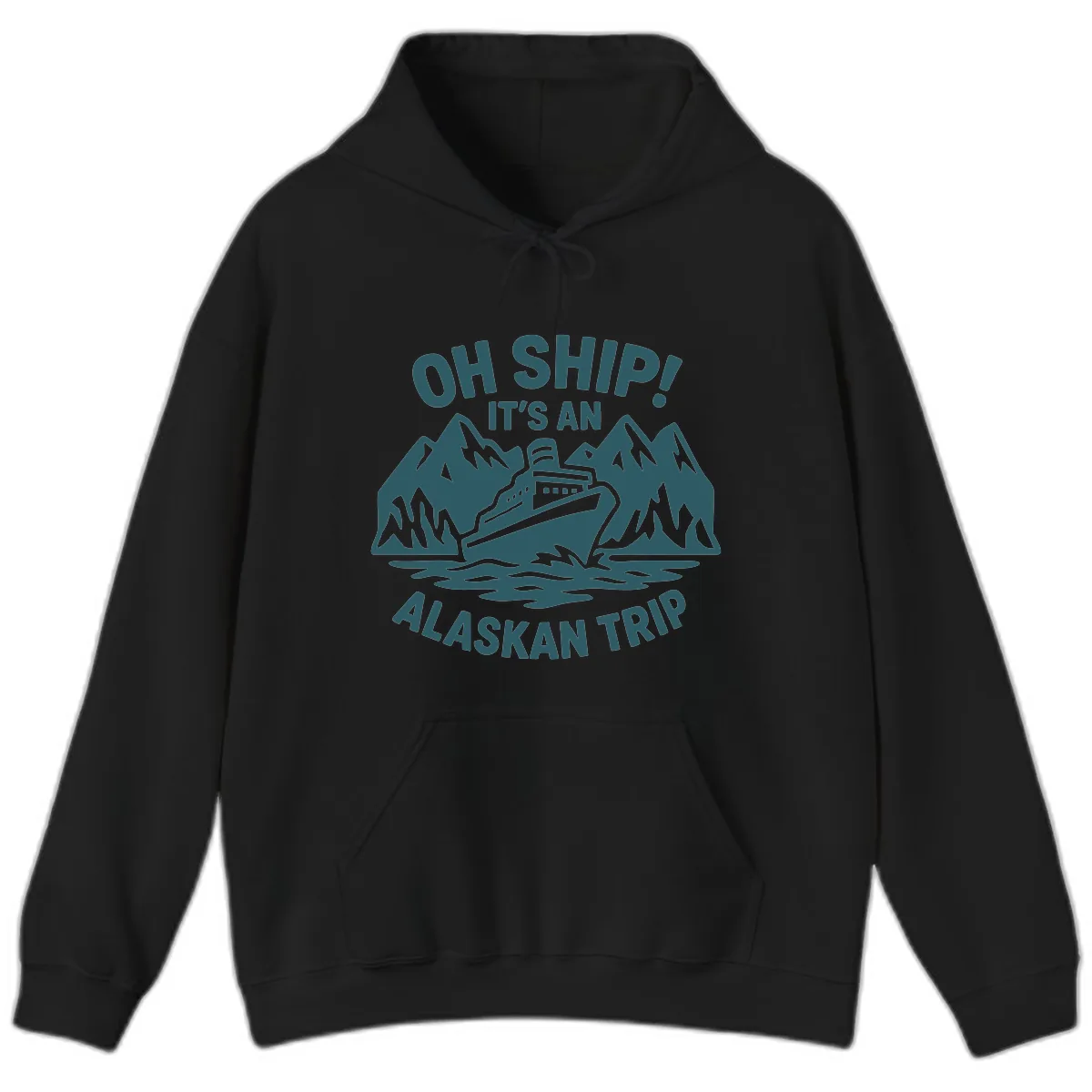 The hoodie prominently features the 'OH SHIP! IT'S AN ALASKAN TRIP' design, including the cruise ship illustration and the humorous text, making it a fun statement piece for your cruise.