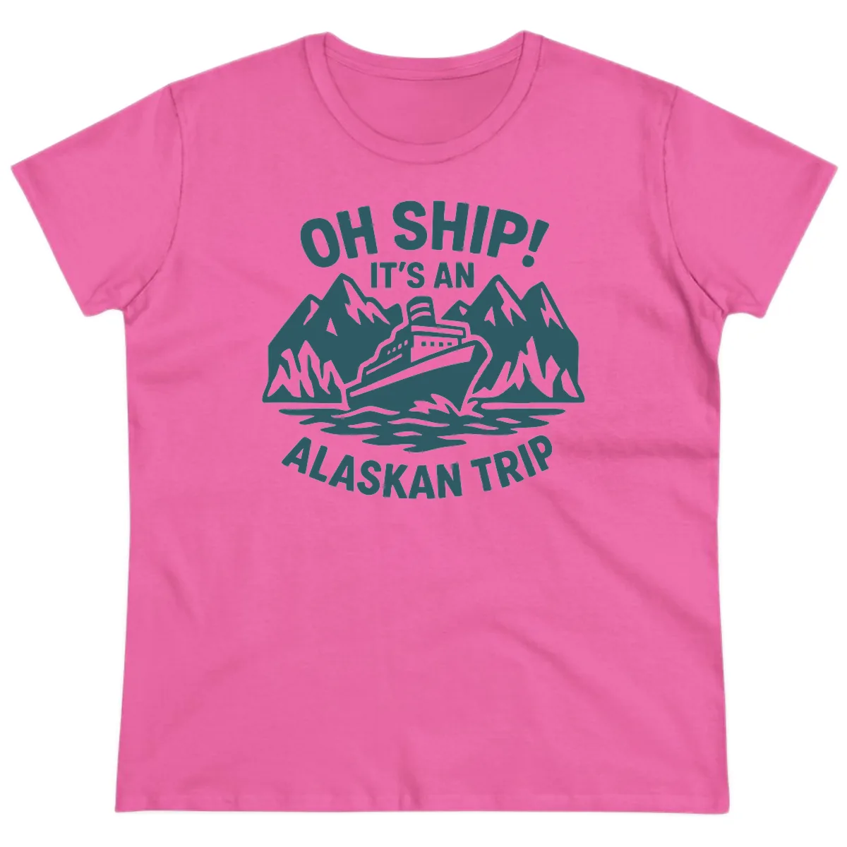 The fun cruise ship illustration and the 'OH SHIP! IT'S AN ALASKAN TRIP' text are beautifully rendered on the ladies' tee, complementing its feminine cut.