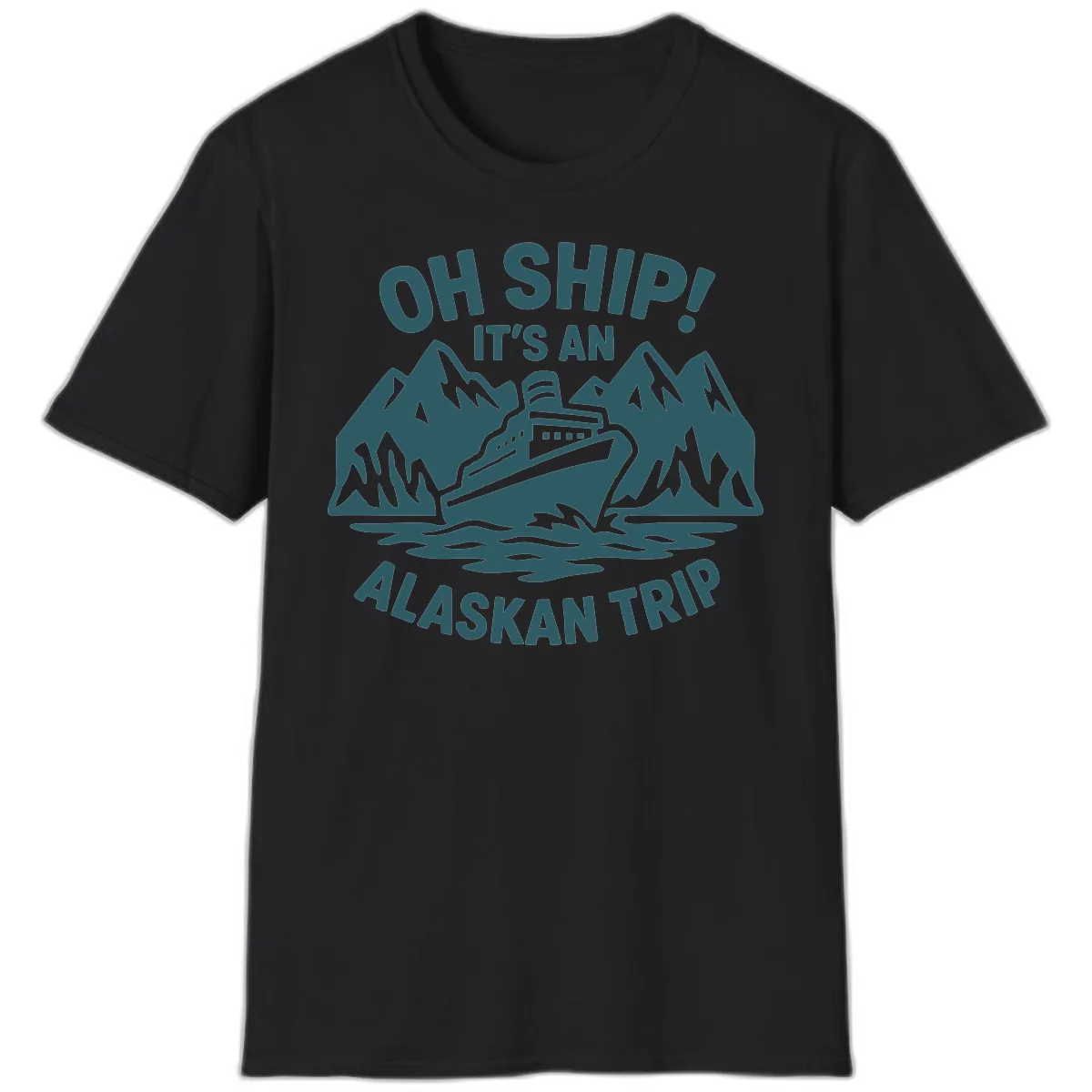 This T-shirt features a fun, punny design perfect for Alaskan cruises. It showcases a cruise ship sailing between snowy mountains, with the text 'OH SHIP! IT'S AN ALASKAN TRIP' making a playful statement.