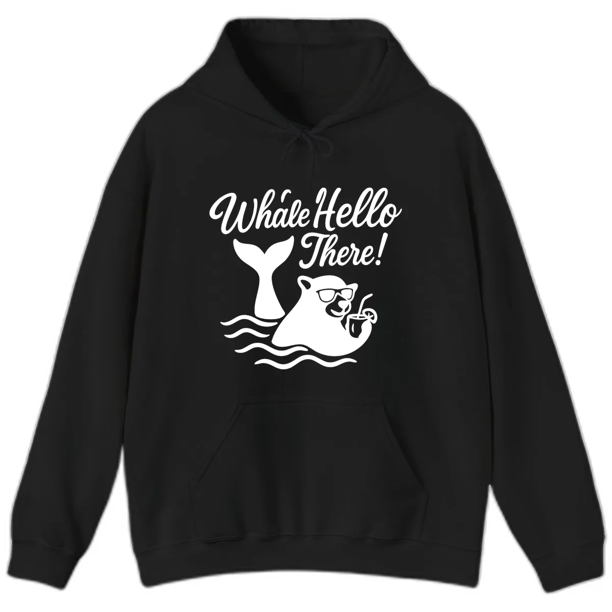 The playful whale illustration and the 'Whale Hello There!' text are prominently displayed on the hoodie, ensuring your fun cruise pun is visible and adds a cheerful touch to the comfortable garment.