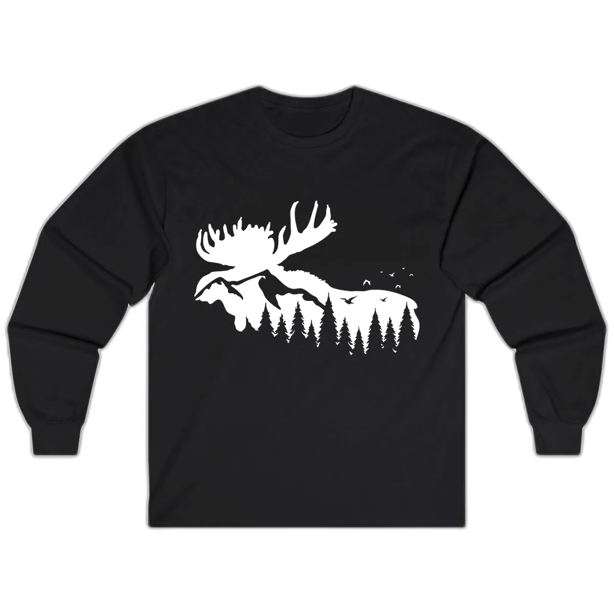 The striking silhouette of the moose, mountains, and forest is prominently displayed, offering a full scenic view that is enhanced by the longer sleeves.