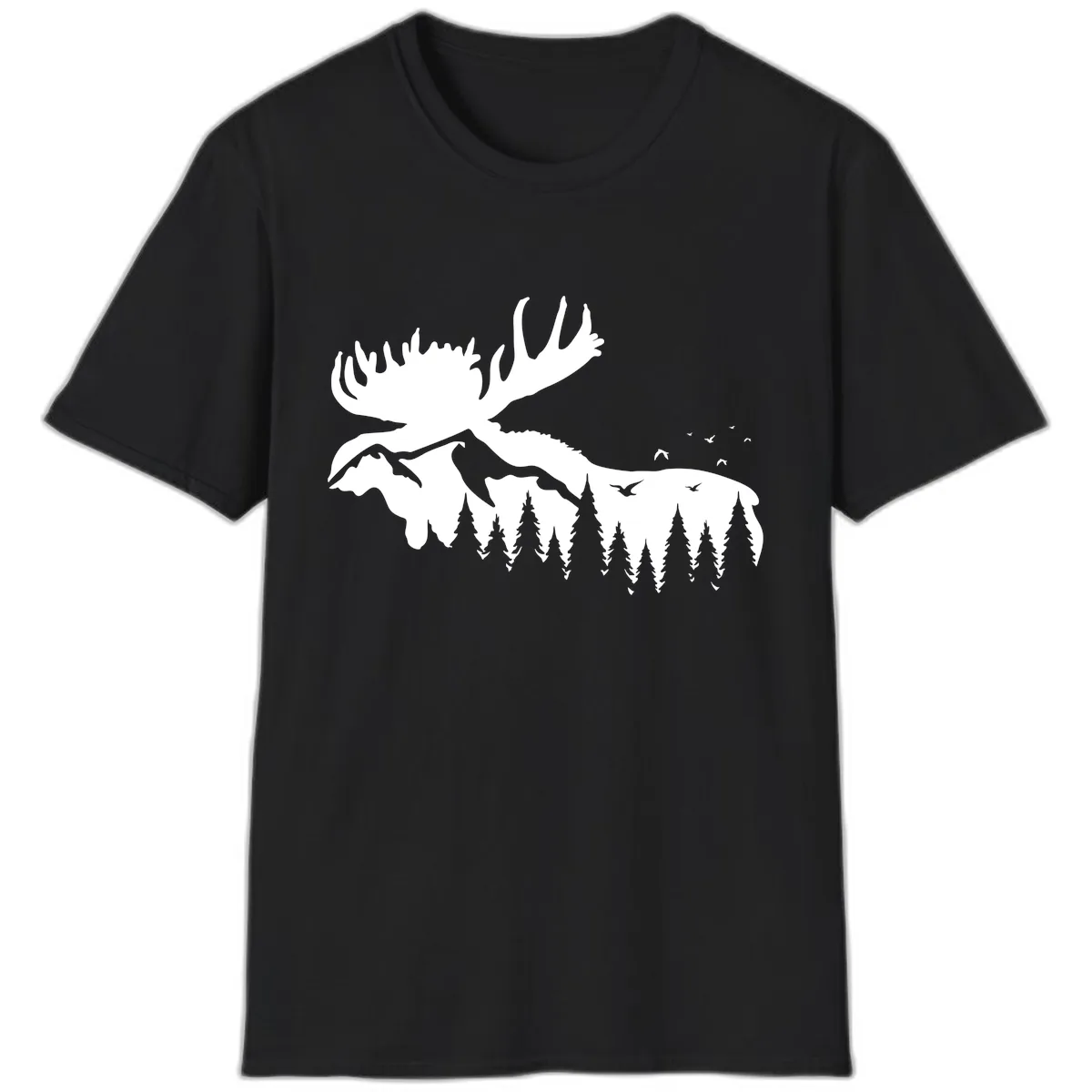 This t-shirt showcases a striking silhouette of a majestic moose with large antlers, beautifully integrated into a mountainous landscape with a dense evergreen forest.