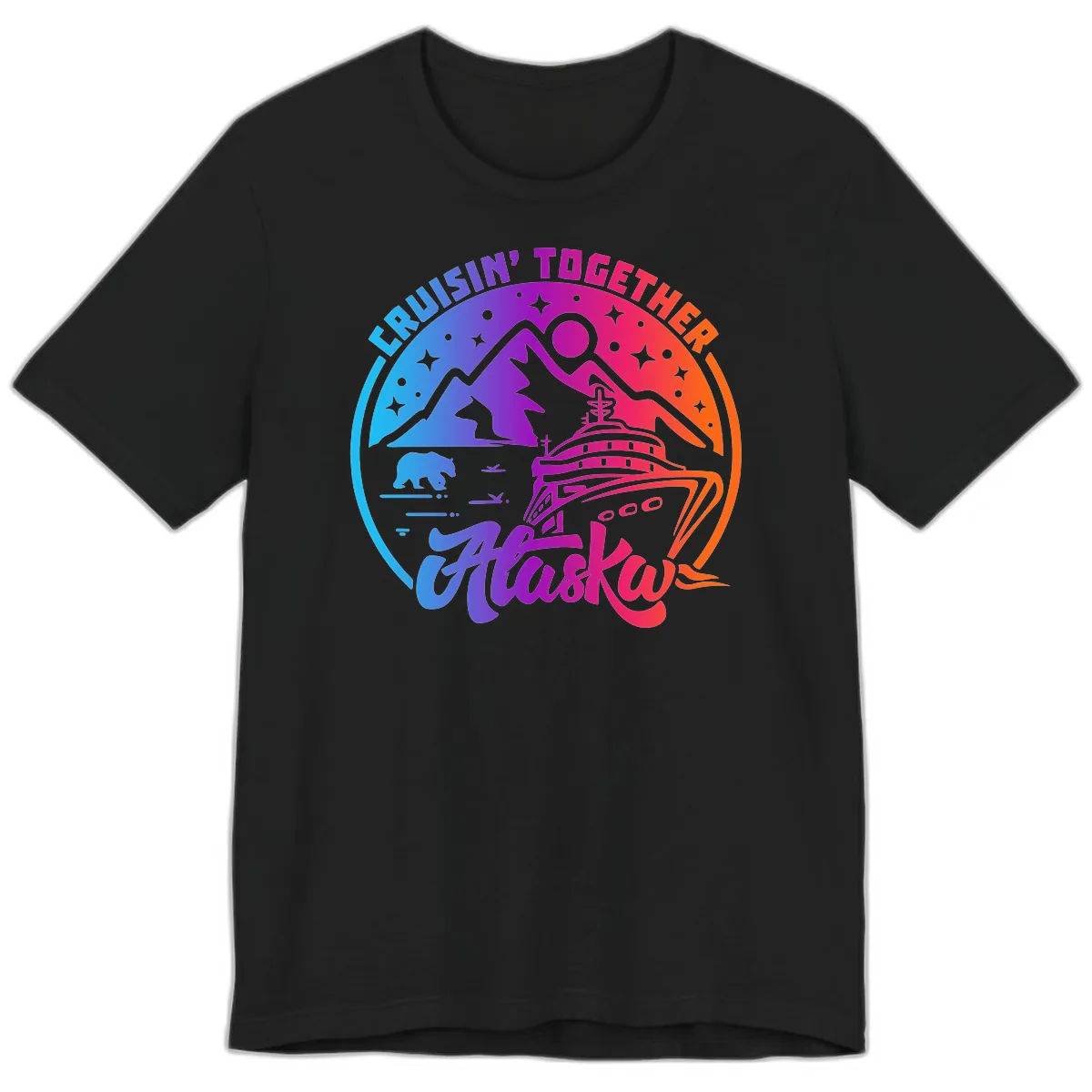 Make a statement on your Alaskan cruise with the 'Cruisin' Together Alaska' Premium T-Shirt. This isn't just any tee; it's a wearable piece of art designed to capture the magic of your group's adventure. The design bursts with a stunning rainbow gradient, highlighting Alaska's majestic mountains, iconic wildlife, and a classic cruise ship, all encircled by energetic text. It’s the perfect blend of fun, fashion, and group spirit for your unforgettable journey.