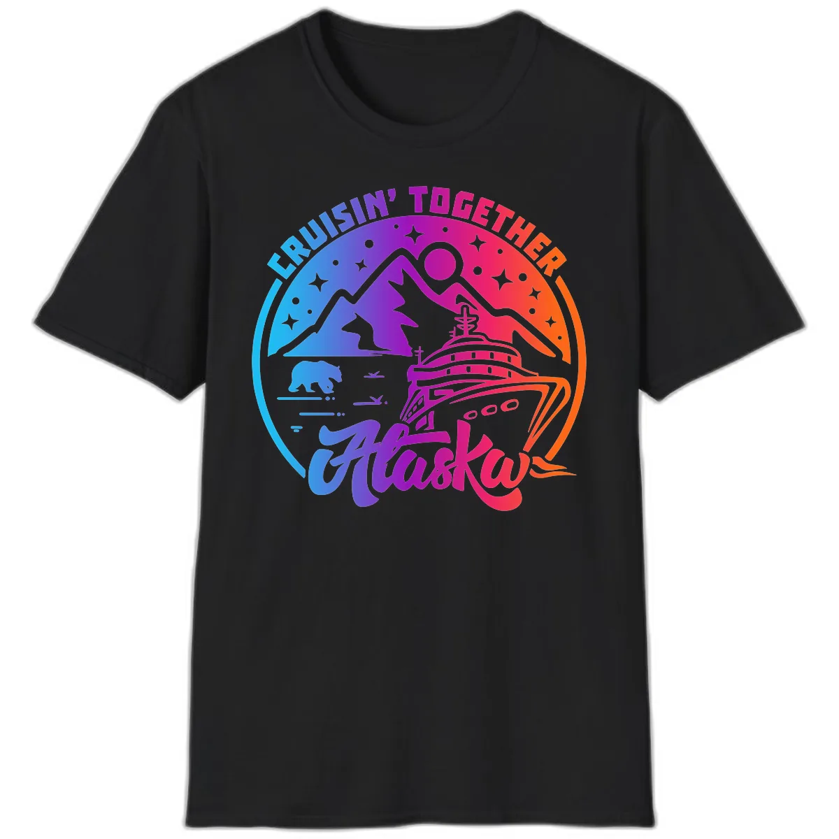 The t-shirt features a vibrant, gradient-filled circular design with iconic Alaska imagery like mountains, wildlife, and a cruise ship. It also includes a hiker silhouette and playful stars, all framing the text 'CRUISIN' TOGETHER Alaska'.