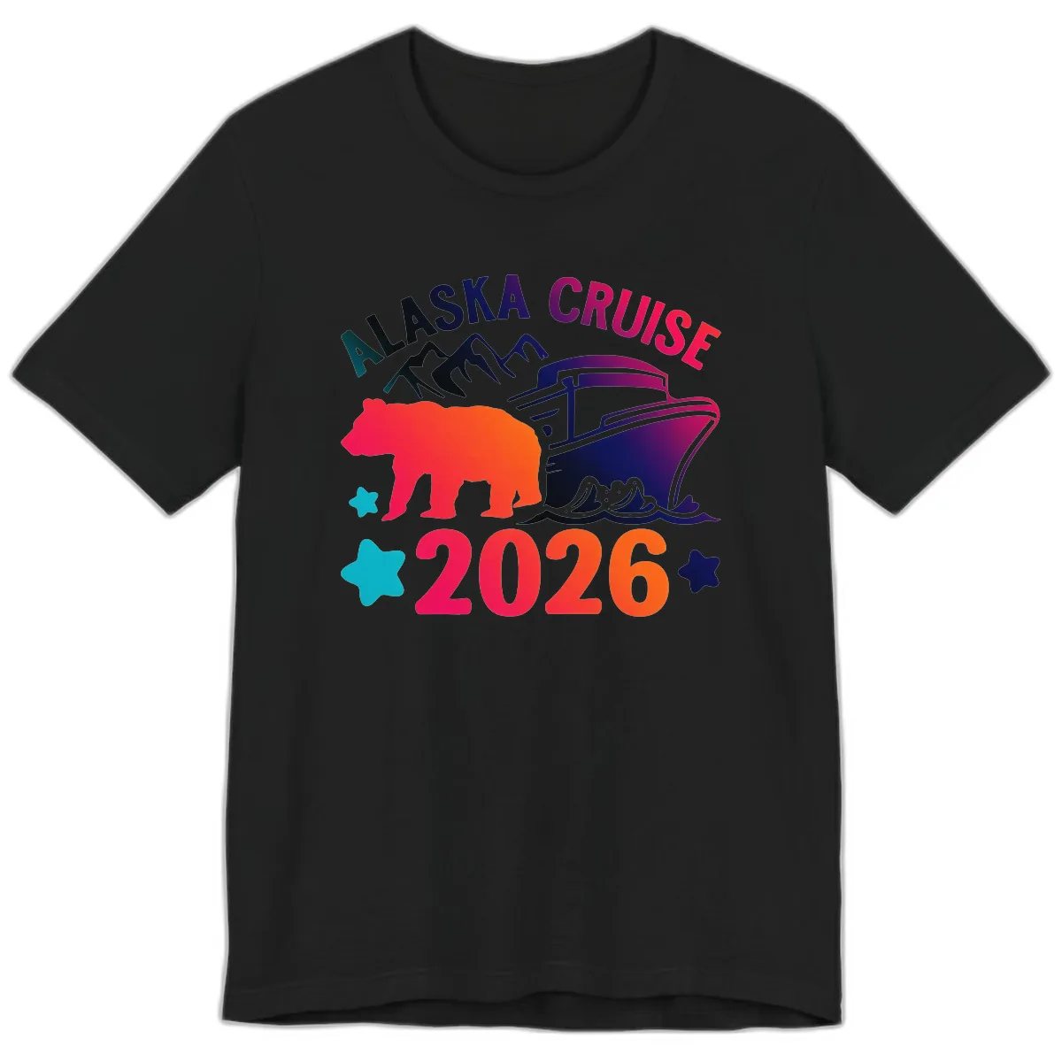 Ready to make waves on your 2026 Alaska cruise? This premium tee is your ticket to stylish vacation vibes. Featuring a stunning design with a gradient bear silhouette, a sleek cruise ship navigating white-capped waves, and majestic snow-capped mountains, it’s a wearable piece of art. The 'ALASKA CRUISE 2026' text shines in a dazzling gradient, accented with playful stars, ensuring you look as good as you feel.