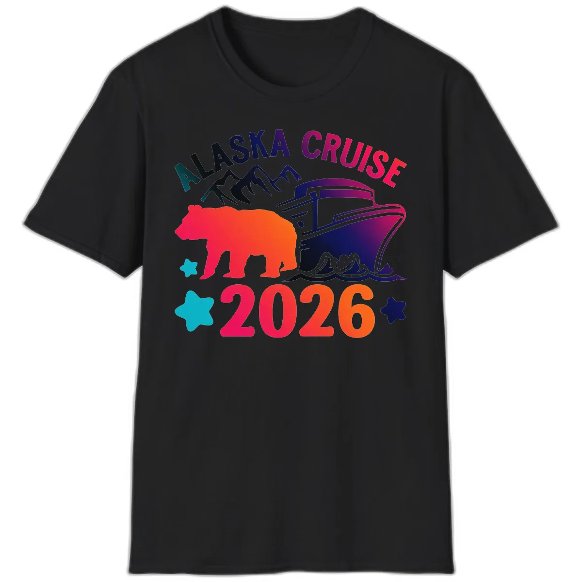 Celebrate your epic 2026 Alaska adventure with a tee that’s as bold and vibrant as the Last Frontier itself! This design captures the thrill of your journey, featuring an iconic bear silhouette, a majestic cruise ship, and stunning mountain scenery, all brought to life with a dazzling gradient and playful stars. It’s the perfect way to commemorate your voyage and stand out from the crowd.