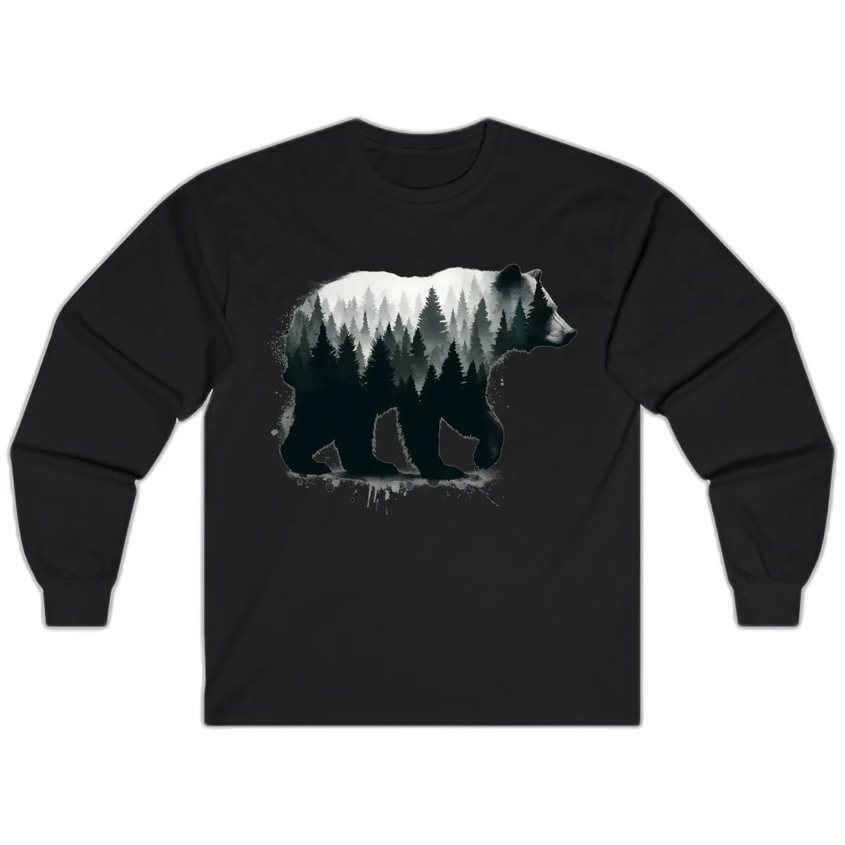 Yes, the design is expertly placed to utilize the full canvas of the long sleeves, ensuring the artistic bear silhouette, forest, mountains, and ink splatter details are prominently displayed.