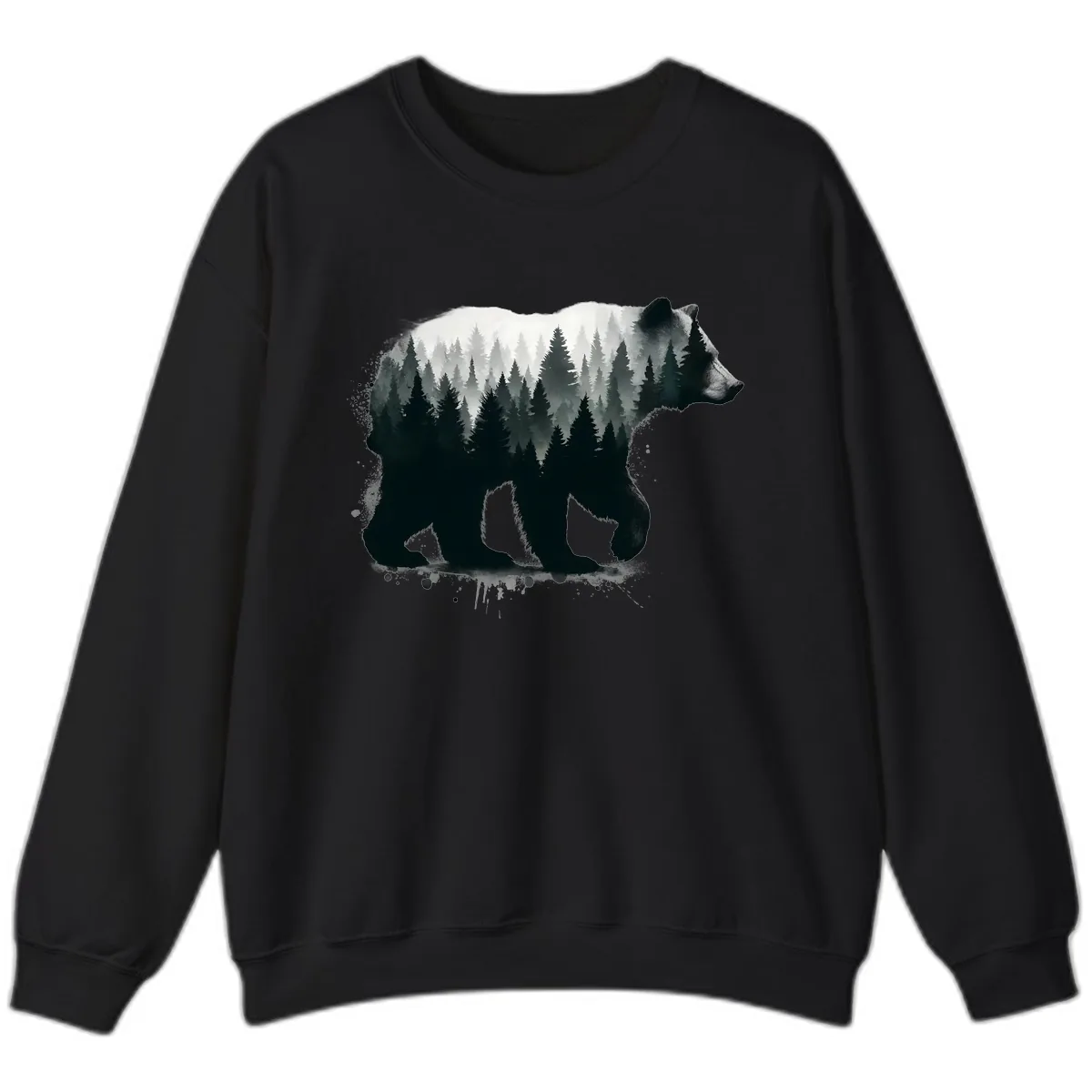 The striking double-exposure illustration of the bear silhouette filled with a misty forest and mountains, including the artistic ink splatter, looks bold and impactful on this cozy sweatshirt.