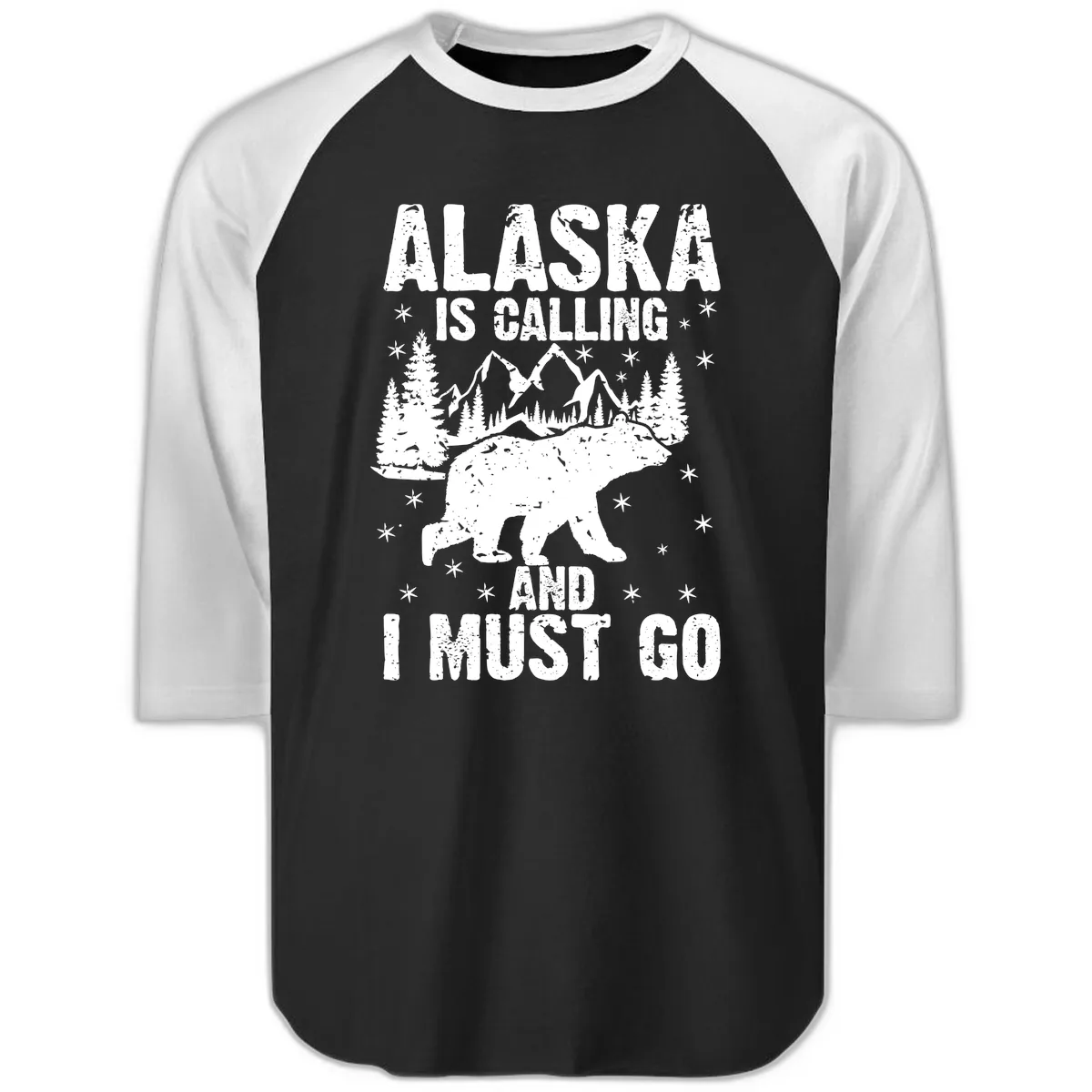 - ✓ Bold, distressed "ALASKA IS CALLING AND I MUST GO" text.