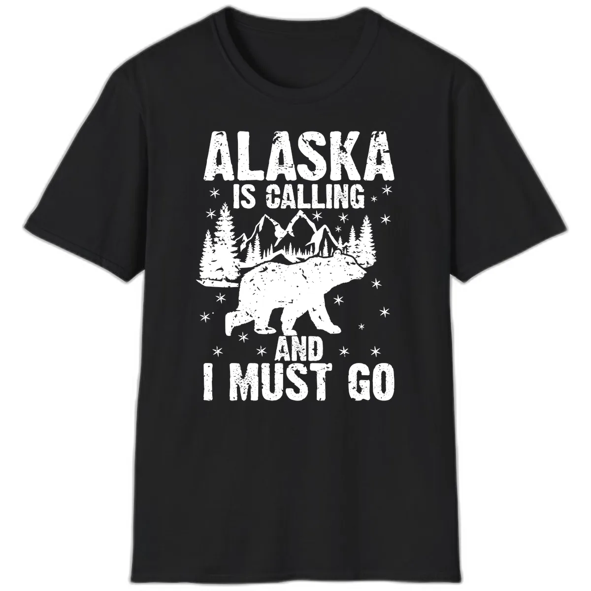 The design prominently features a polar bear, snow-capped mountains, and evergreen trees, all set against a backdrop of scattered snowflakes. The text 'ALASKA IS CALLING AND I MUST GO' is integrated in a bold, weathered font.
