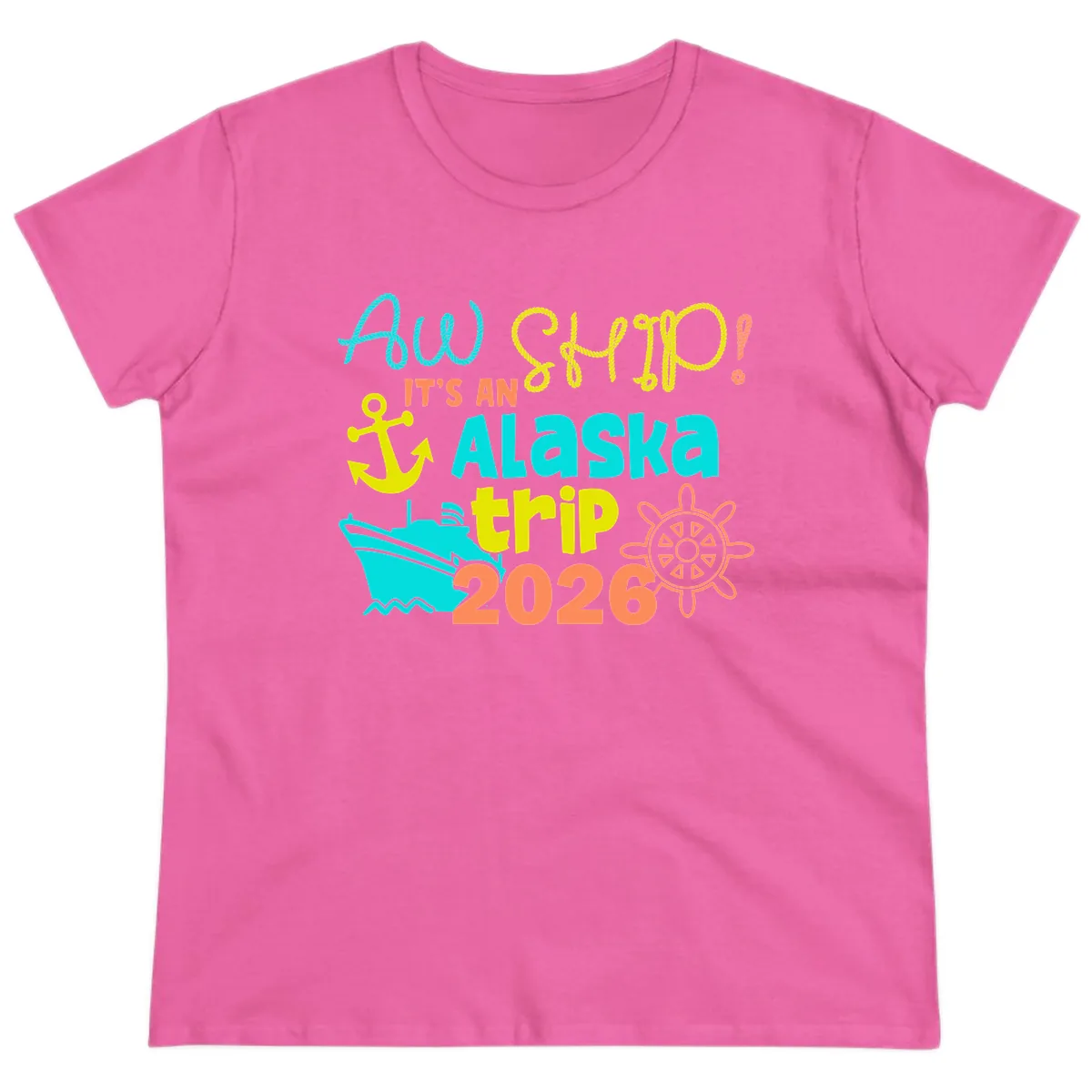 Get ready to sail in style with the "Ahoy It's An Alaska Trip 2026" Ladies Tee! This design is all about celebrating your 2026 Alaska cruise with a splash of nautical fun. Featuring playful rope lettering and a lively mix of maritime graphics, it’s the perfect way to announce your adventure and look fabulous doing it. From embarkation day to glacier gazing, this tee is your new favorite cruise companion.