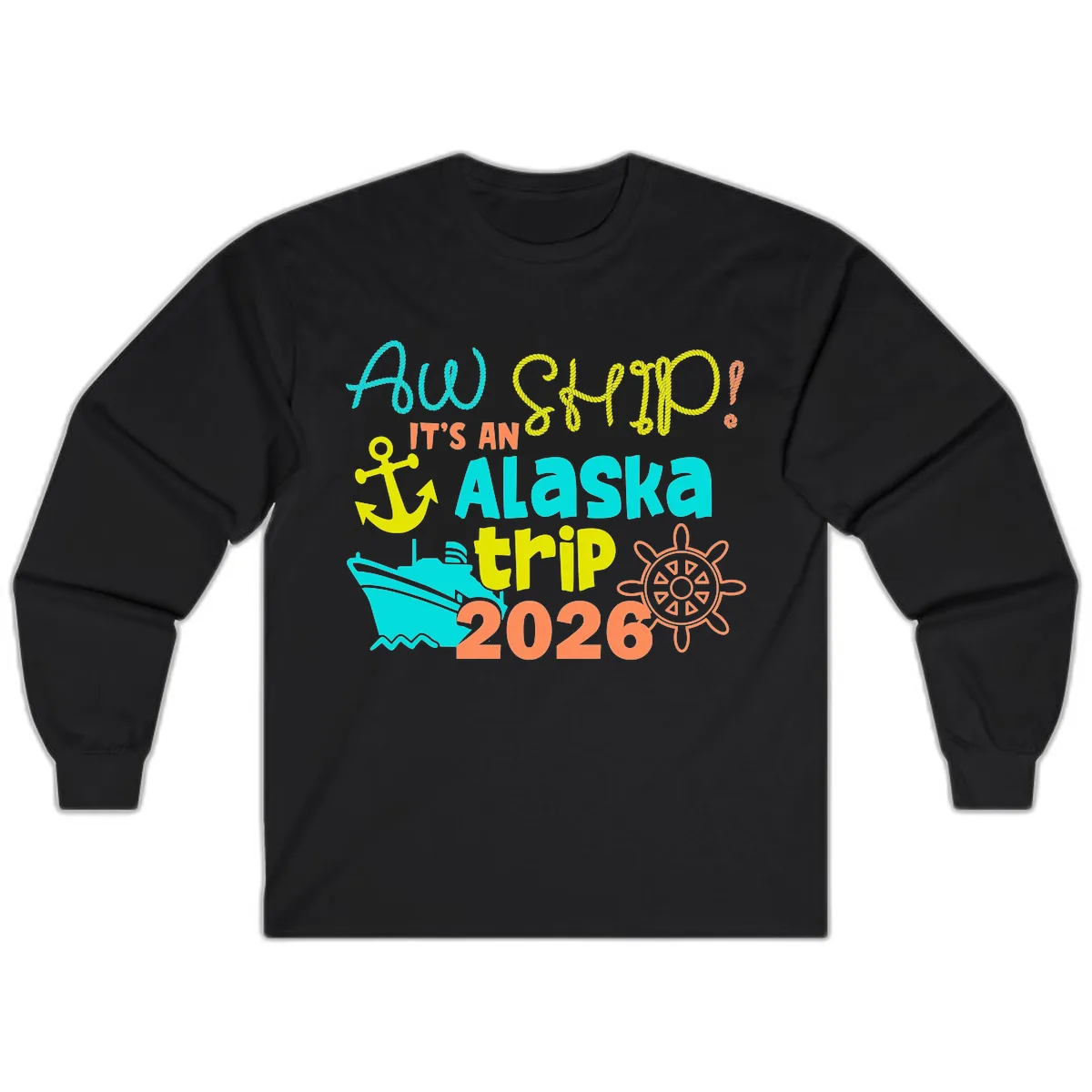 Absolutely. The vibrant nautical graphics and colorful rope lettering of the 'Ahoy 2026!' and 'It's An Alaska Trip' design are printed clearly on the long sleeves and front, ensuring your cruise announcement is visible.