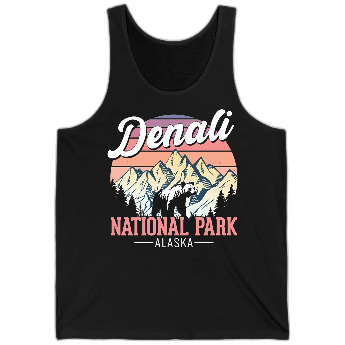 The vibrant retro sunset gradient and bold 'DENALI NATIONAL PARK' text are printed crisply on the tank top, offering a stylish and eye-catching way to showcase the vintage travel poster aesthetic.