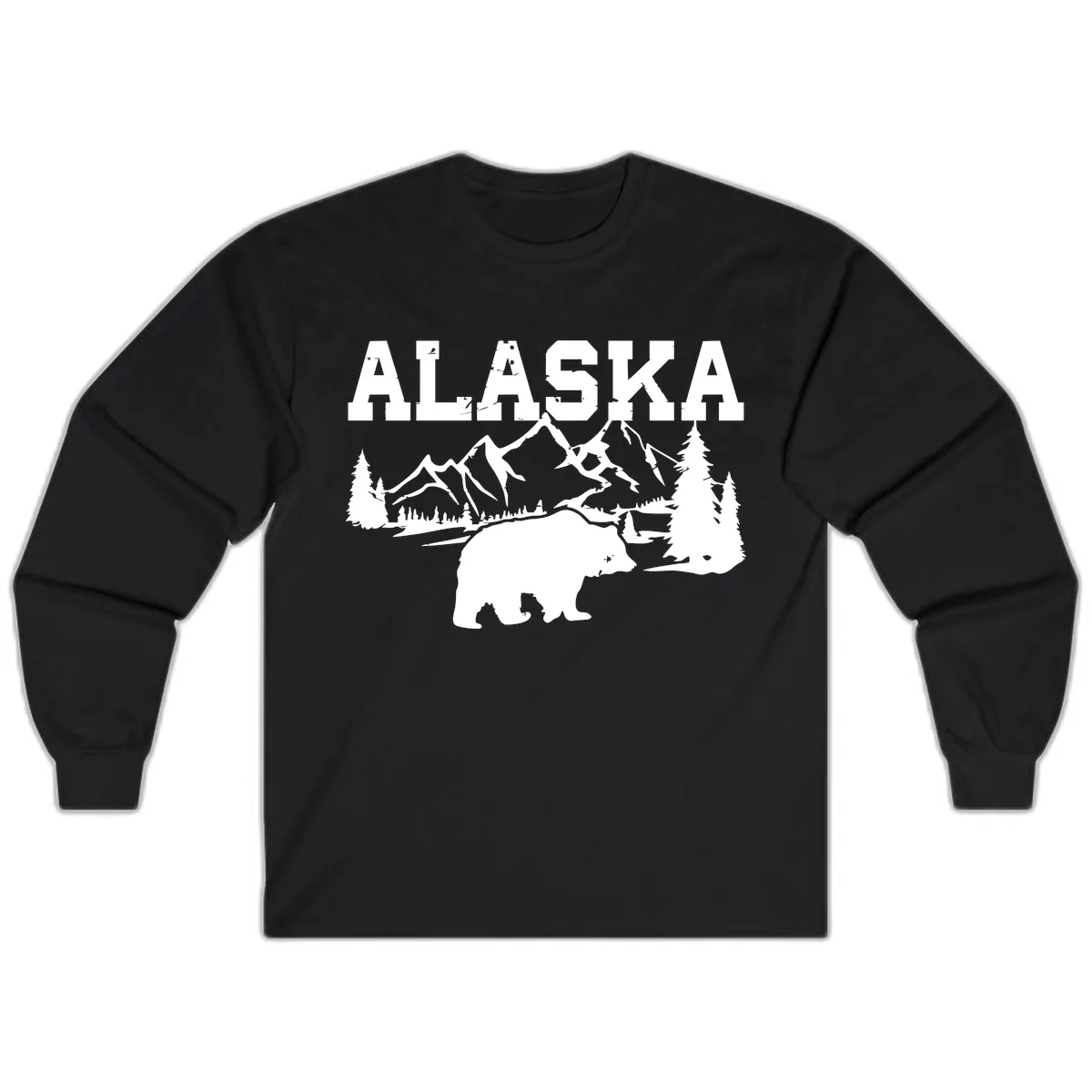 The full scenic design, including the bold 'ALASKA' text, bear, mountains, and wilderness landscape, is beautifully displayed across the front of the long sleeve tee.