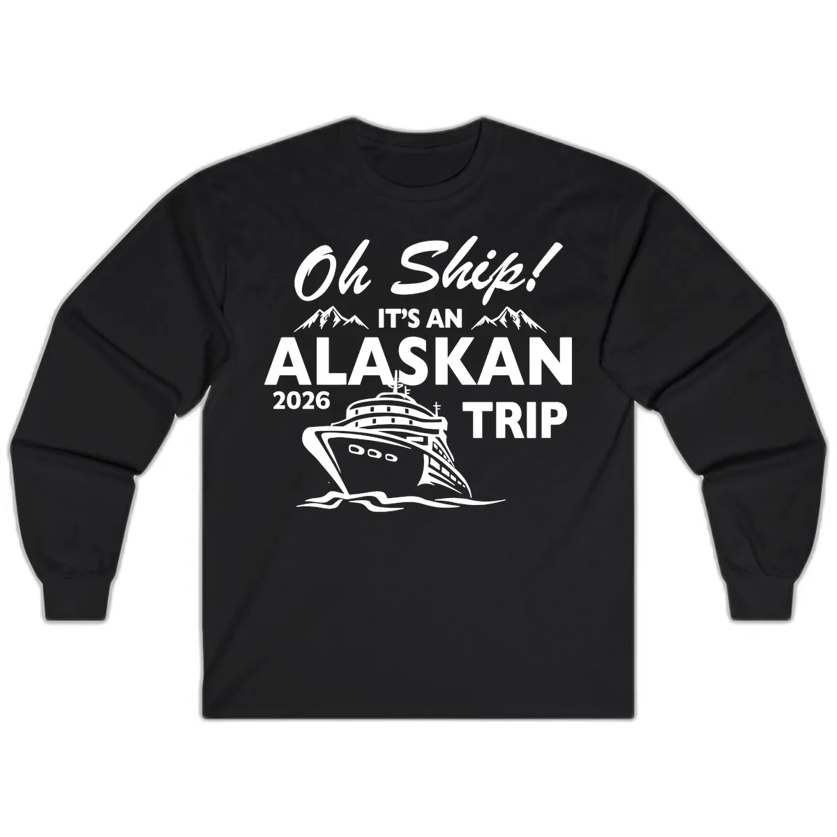 The 'Oh Ship! IT'S AN ALASKAN 2026 TRIP' design, with its detailed illustrations and bold text, stands out well on the long sleeves. It offers more canvas space to appreciate the cruise ship, mountains, and ice floes.