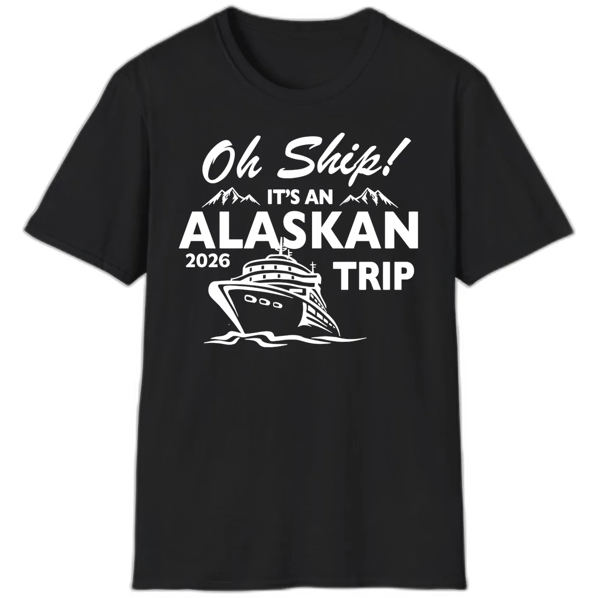 This T-shirt features an illustrated text design. It includes the playful script 'Oh Ship!' paired with bold block text reading 'IT'S AN ALASKAN 2026 TRIP,' all accented by a detailed cruise ship, mountains, and ice floes.