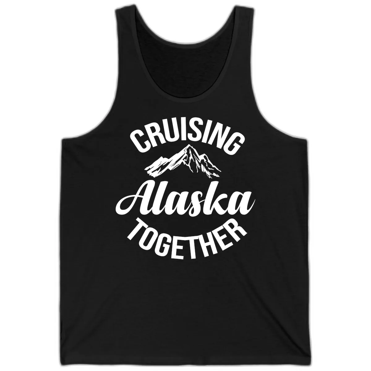 The bold, vintage-inspired 'CRUISING ALASKA TOGETHER' text and mountain graphic are printed clearly, providing a fun and stylish look on this casual tank.