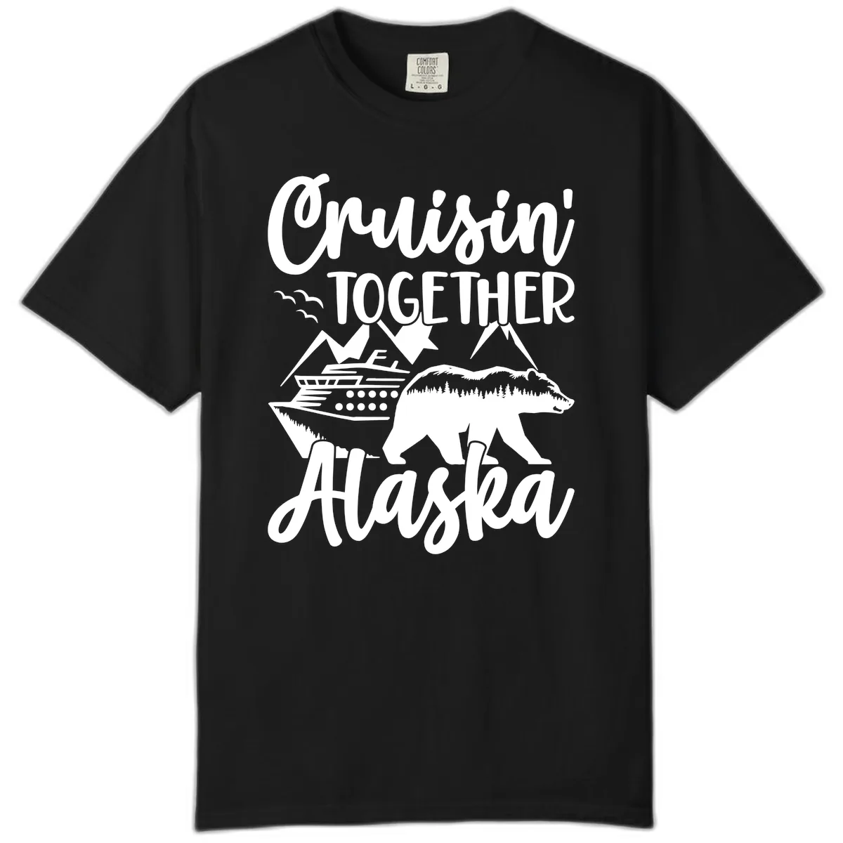- ✓ Fun 'Cruisin' Together Alaska' graphic featuring unique bear and scenic elements.