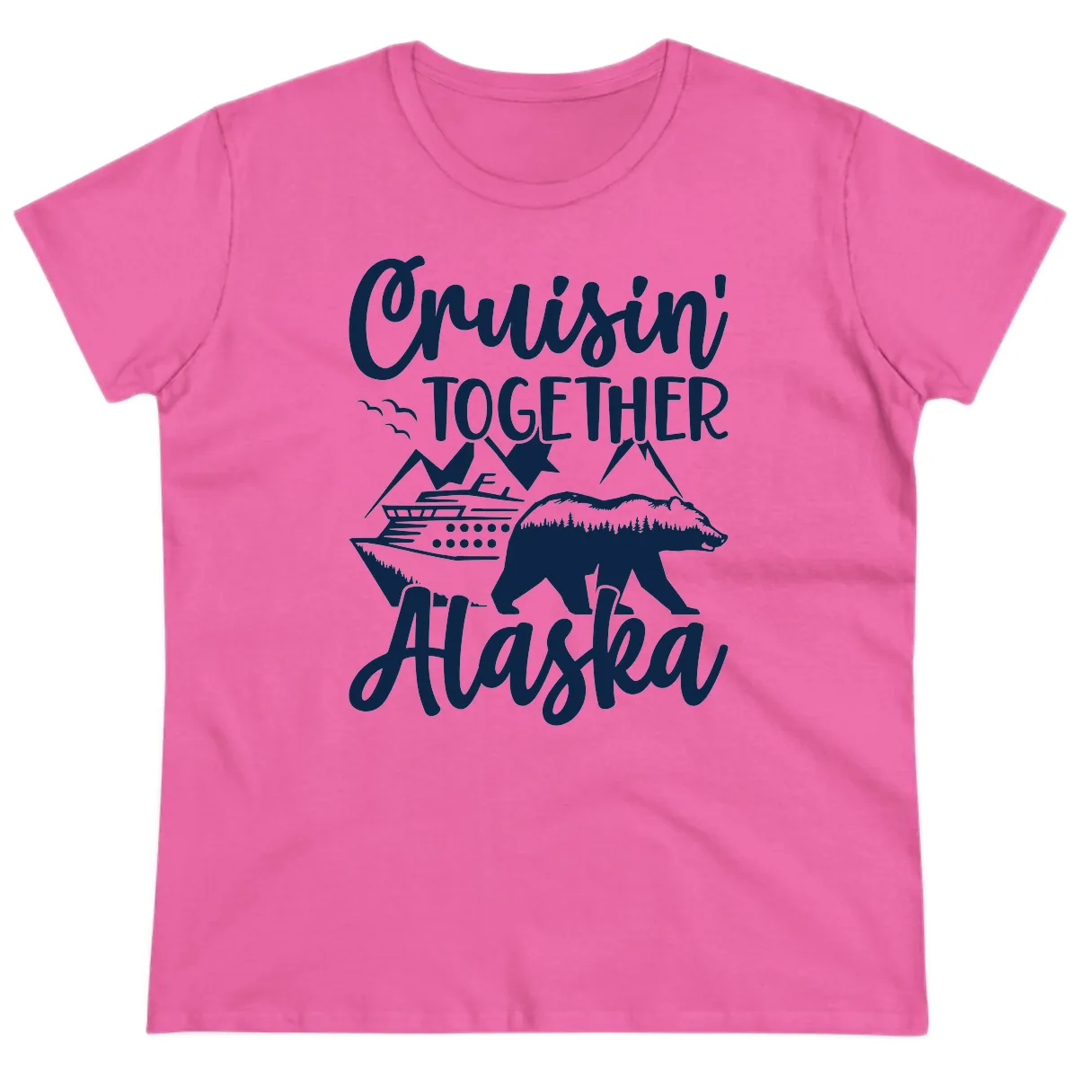 The 'Cruisin' Together Alaska' design, with its cruise ship, bear, mountains, and text, is printed to look great on this specifically tailored women's fit.