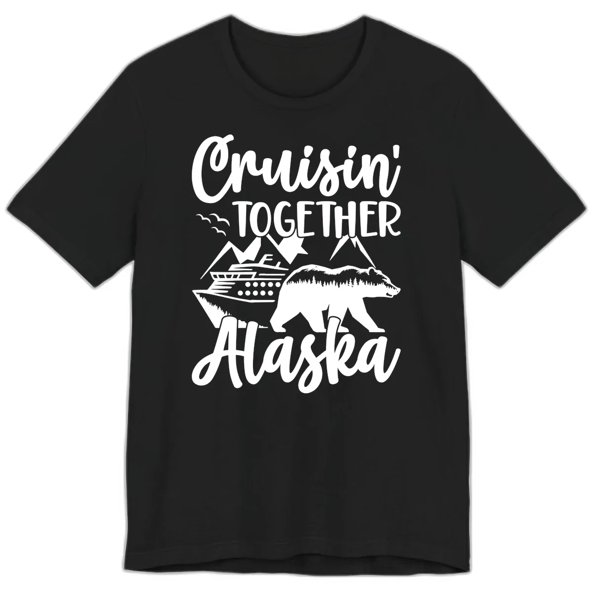 Elevate your Alaska cruise experience with the 'Cruisin' Together Alaska' Premium T-Shirt. This tee boasts a stunning design that merges the fun of group cruising with the breathtaking landscapes of Alaska, featuring a unique bear illustration filled with forest scenery. It’s more than just a shirt; it’s a badge of honor for your Alaskan adventure.
