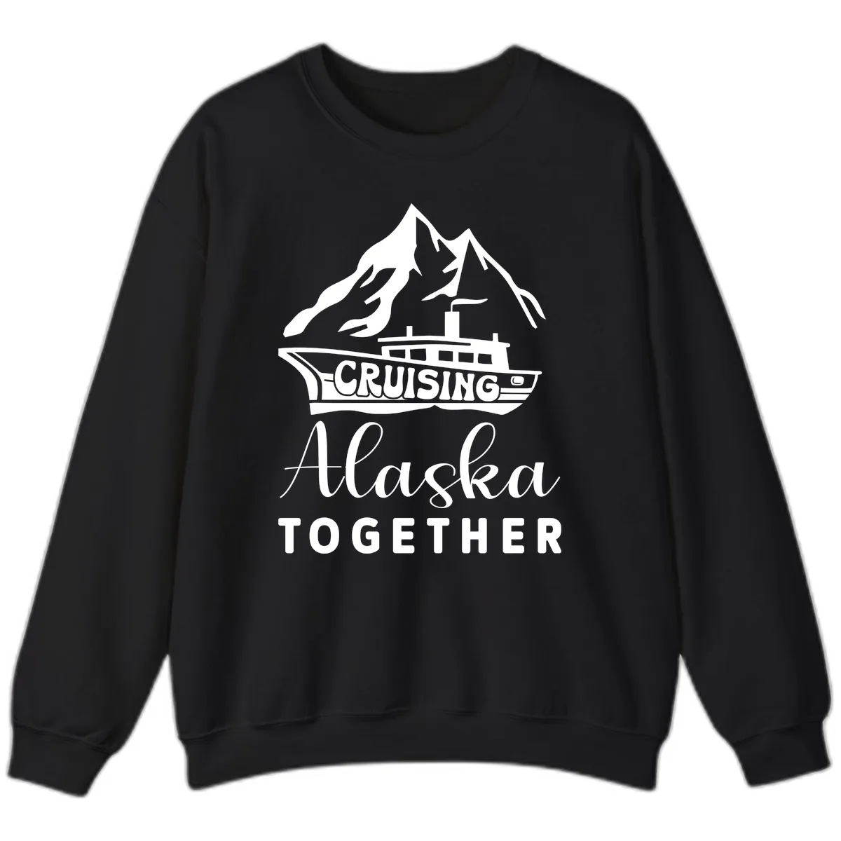 The design features a cruise ship sailing past majestic snow-capped mountains and glaciers, with the bold "CRUISING Alaska TOGETHER" text. The graphic is printed to stand out on the sweatshirt fabric.