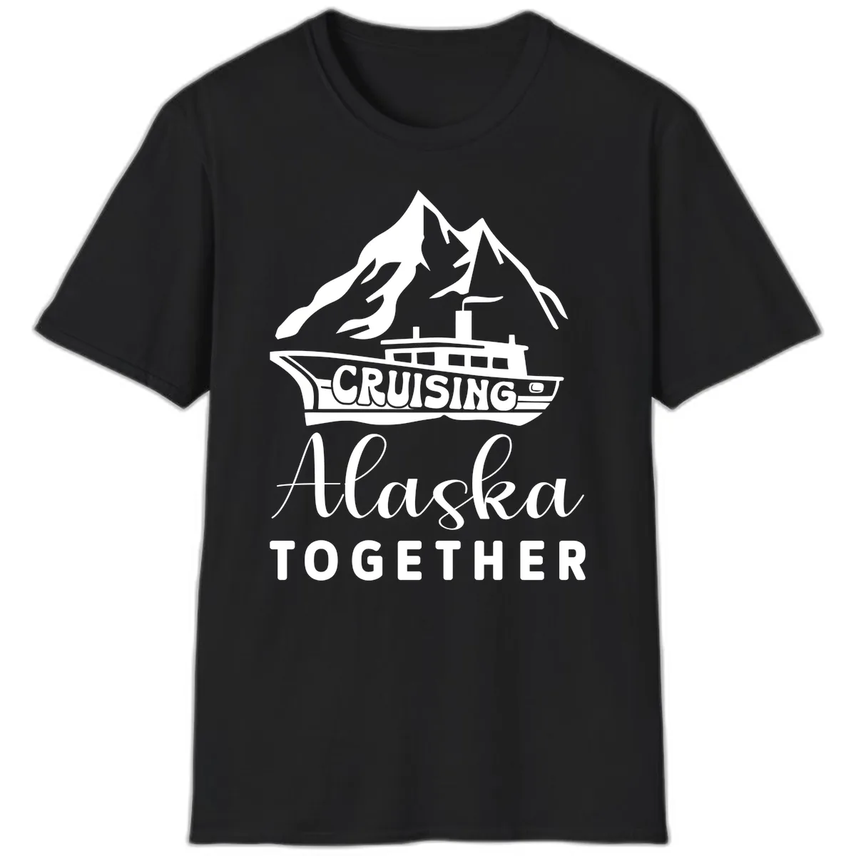This T-shirt features a scenic Alaska cruise design. It showcases a classic cruise ship sailing past majestic snow-covered mountains and glaciers, with the text "CRUISING Alaska TOGETHER" prominently displayed.