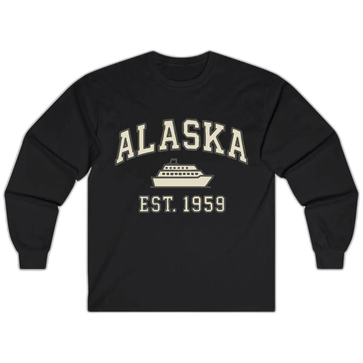 Embrace the spirit of classic exploration with this 'EST. 1959' Alaska cruise long sleeve. Featuring a bold, vintage-inspired design with 'ALASKA' arched above a charming cruise ship and anchored by 'EST. 1959', this tee is a nod to the golden age of Alaskan voyages. Perfect for layering or cooler evenings, it brings retro vibes to your adventure.