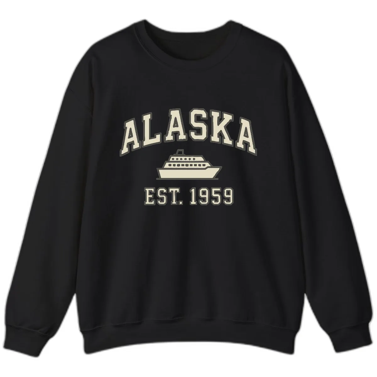 Wrap yourself in nostalgia with this vintage-inspired 'EST. 1959' Alaska cruise sweatshirt. The design showcases bold 'ALASKA' lettering, a classic ship illustration, and retro 'EST. 1959' typography, reminiscent of mid-century travel posters. It’s the ultimate cozy companion for your Alaskan voyage, blending timeless style with ultimate comfort.