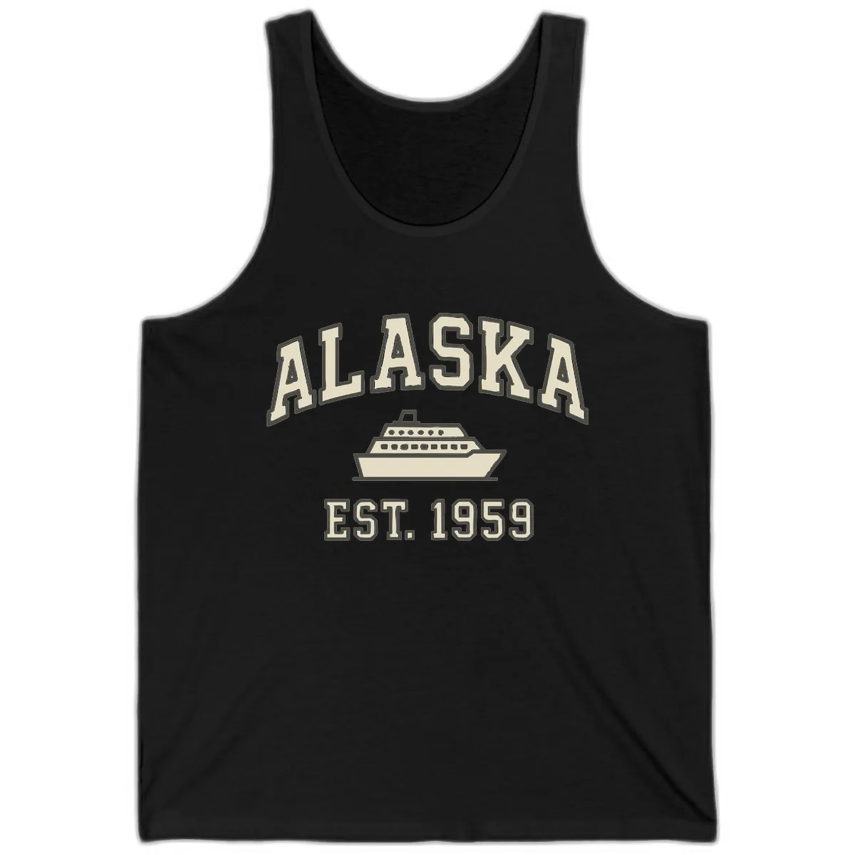 Cruise in cool, retro style with this 'EST. 1959' Alaska tank top. Inspired by the golden era of travel, the design features bold 'ALASKA' lettering, a classic ship illustration, and vintage 'EST. 1959' typography. It’s the perfect lightweight option for warmer days on deck or as a fun layer.