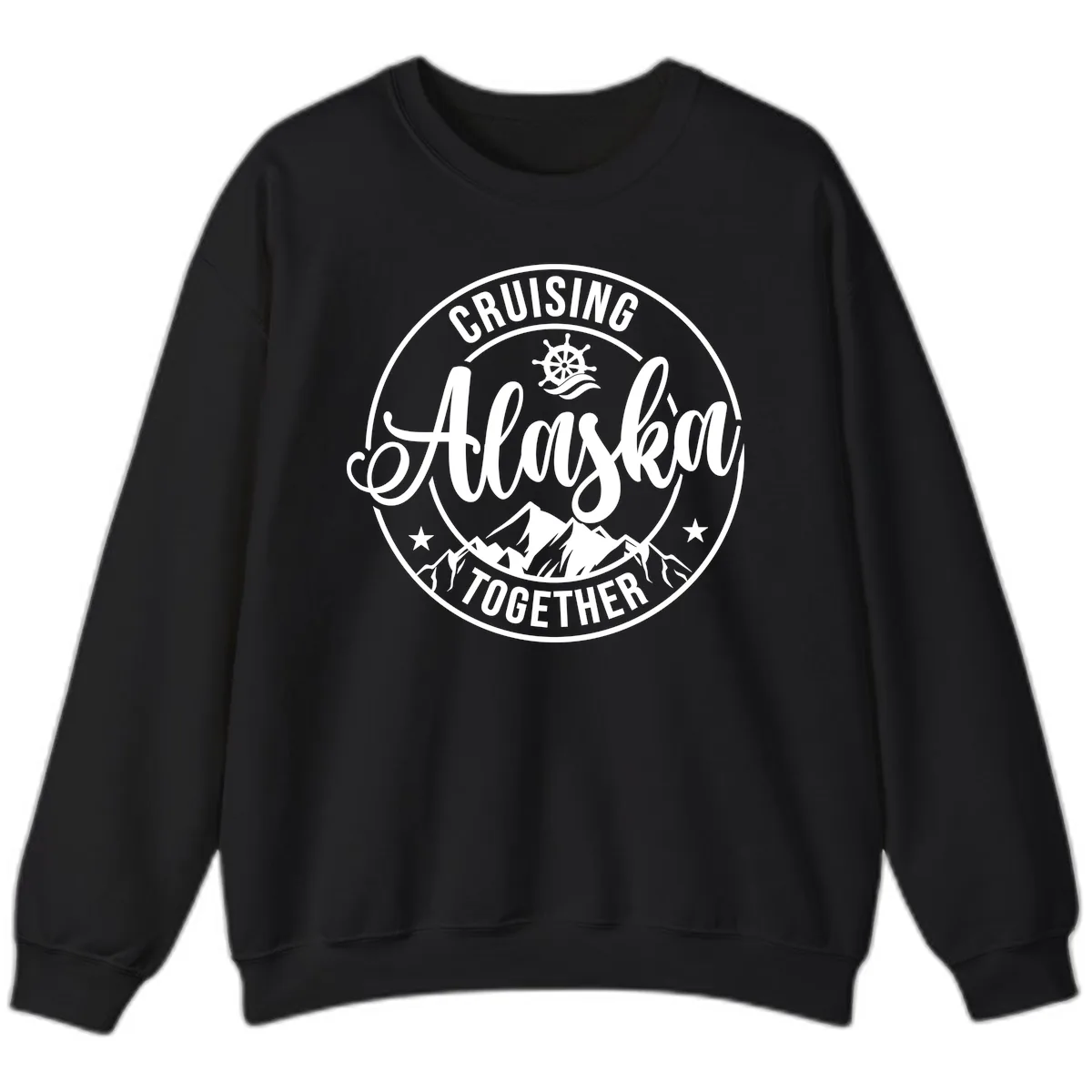 Embrace the spirit of adventure and togetherness with the "Cruising Ashore Together Badge" Sweatshirt. This cozy crewneck is your perfect companion for chilly Alaska evenings or relaxed days at sea. The vintage badge design, featuring a ship's wheel and scenic mountains, adds a touch of classic exploration to your cruise wardrobe, making it ideal for group coordination.