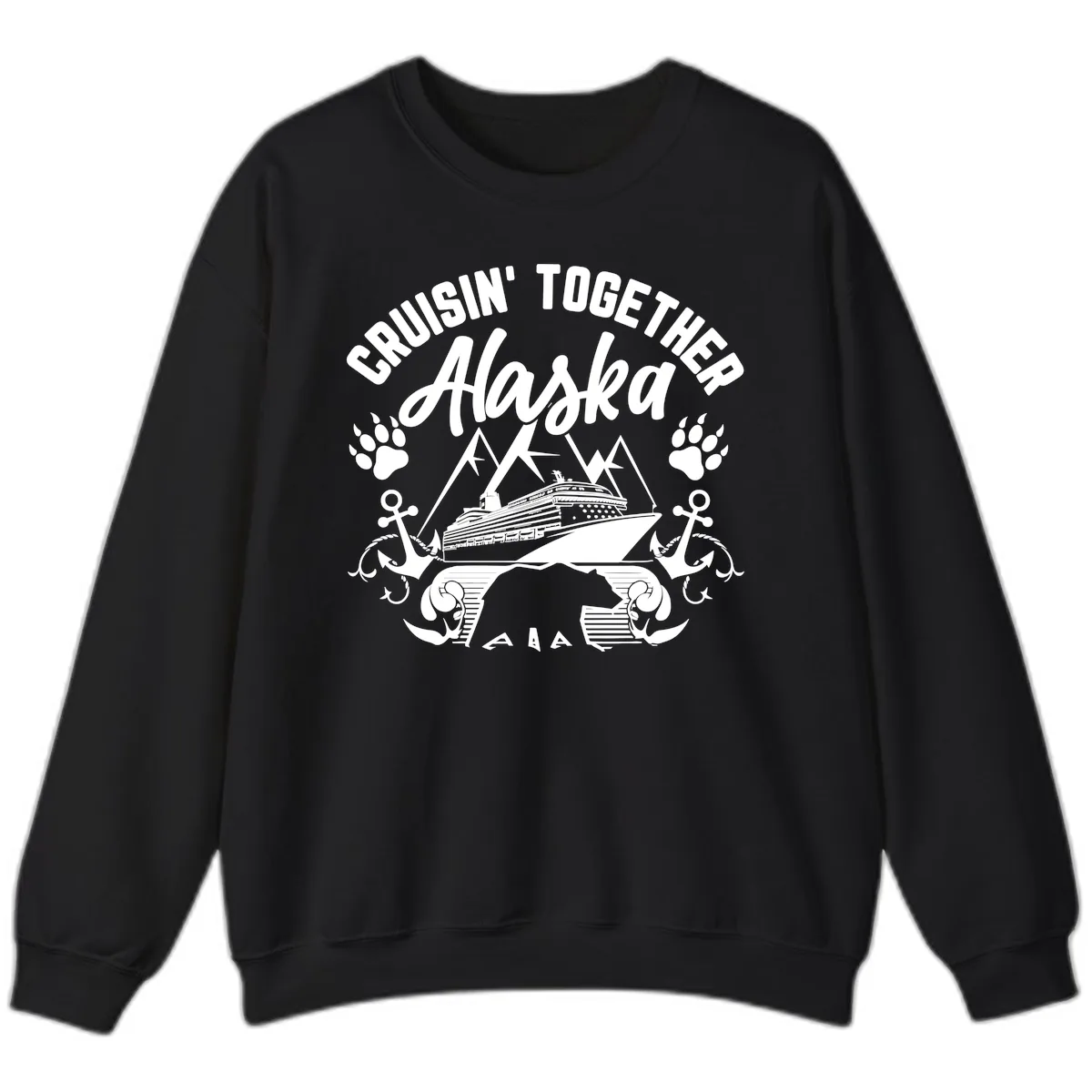 Stay warm and connected on your Alaskan cruise with the "Cruisin' Together Alaska" Sweatshirt! This cozy crewneck features a fantastic nautical design showcasing a cruise ship sailing past majestic mountains, accented with playful paw prints and anchors. The bold "CRUISIN' TOGETHER Alaska" text makes it the ultimate matching apparel for your entire group, ensuring everyone feels part of the adventure.