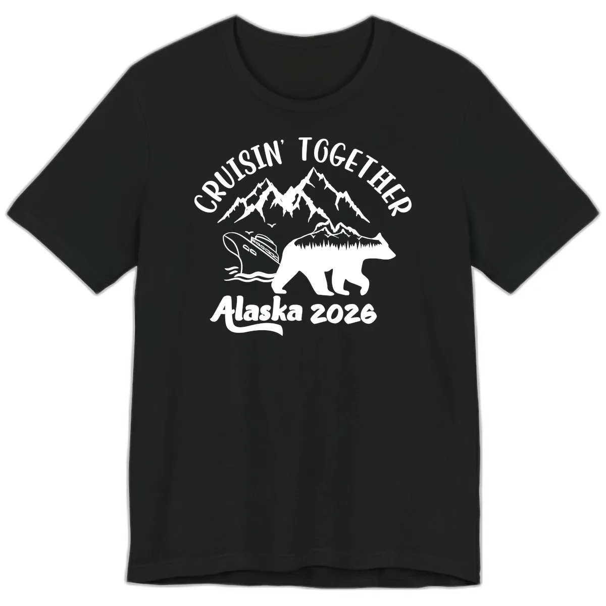 Elevate your Alaska cruise experience with this premium "Cruisin' Together Alaska 2026" tee! It's more than just a shirt; it's a wearable piece of art showcasing a breathtaking Alaskan landscape. Imagine your group rocking this design as you sail through stunning fjords, with a majestic bear silhouette artfully filled with snow-capped peaks and evergreen forests.