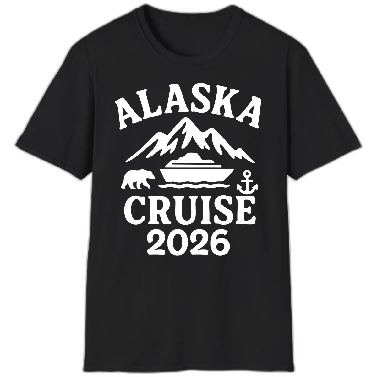 The design prominently displays 'ALASKA CRUISE 2026' and incorporates key Alaskan elements like mountains, a bear, and a cruise ship, making it a perfect memento for your trip.